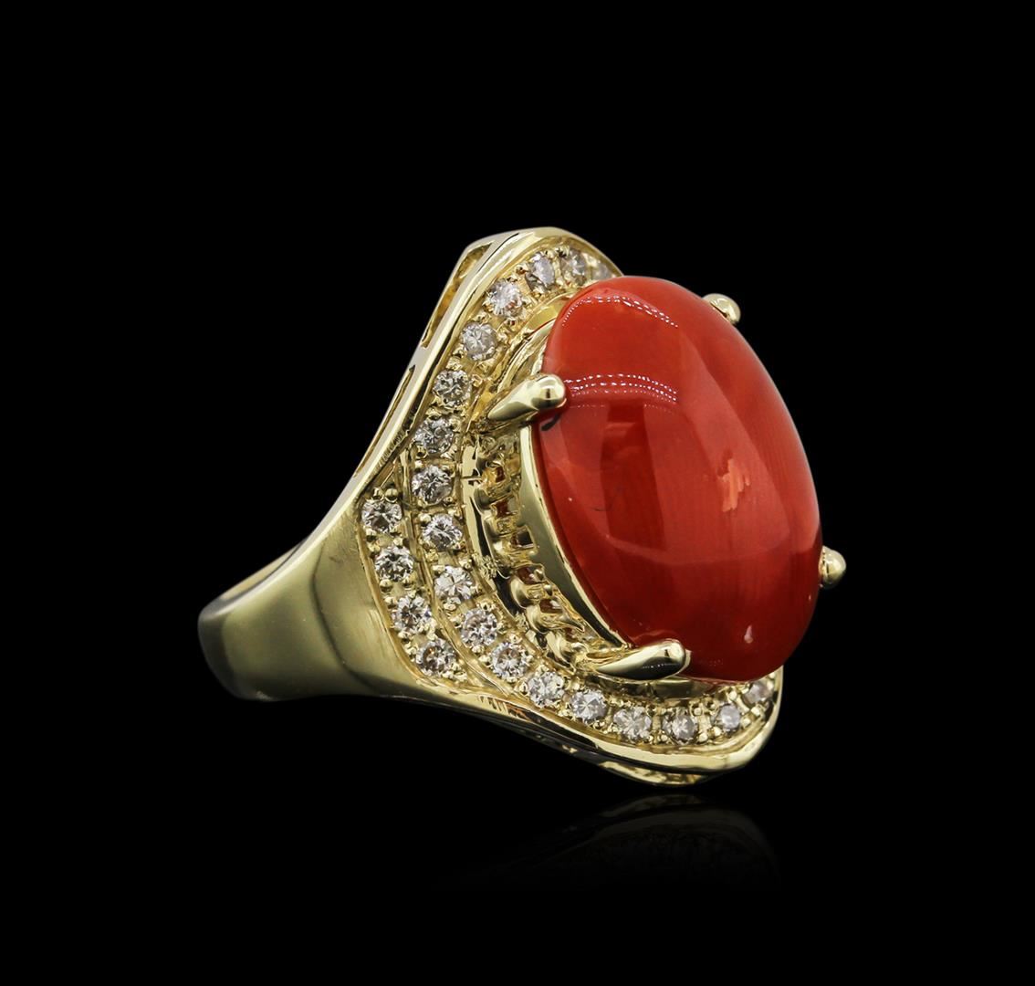 One electronically tested 14KT yellow gold ladies cast coral and diamond ring with a tapered shank with a bright polish finish. Identified with markings of "14K". Condition is new. Containing: One prong set oval cabochon cut natural red coral, measuring 15.97 x 11.41 x 7.42mm, approximate weight of 9.67ct., clarity is heavily included, medium dark, brownish, red color, (GIA R 6/1), cut is good. Thirty-Six prong set round brilliant cut diamonds, measuring 1.50 - 1.50 x 0.90mm (depth est.) approximate total weight of 36 Stones = 0.44ct. Clarity: SI-1 to I-1. Color: K - L, Cut is Good. Diamonds and colored gemstones are graded in the mounting, unless otherwise stated. Colored gemstones are presumed to have been subjected to commonly used enhancement processes. Total Weight of Colored Stones 9.67ct. Total Weight of Diamonds 0.44ct. Total Weight of Ring 10.80 grams. GGL Appraised at $3,645.00.