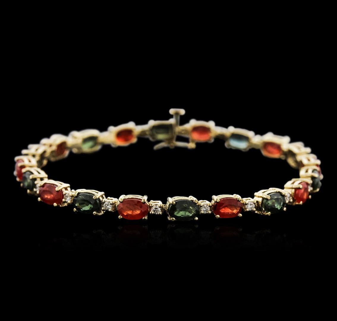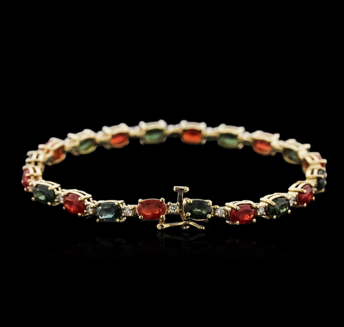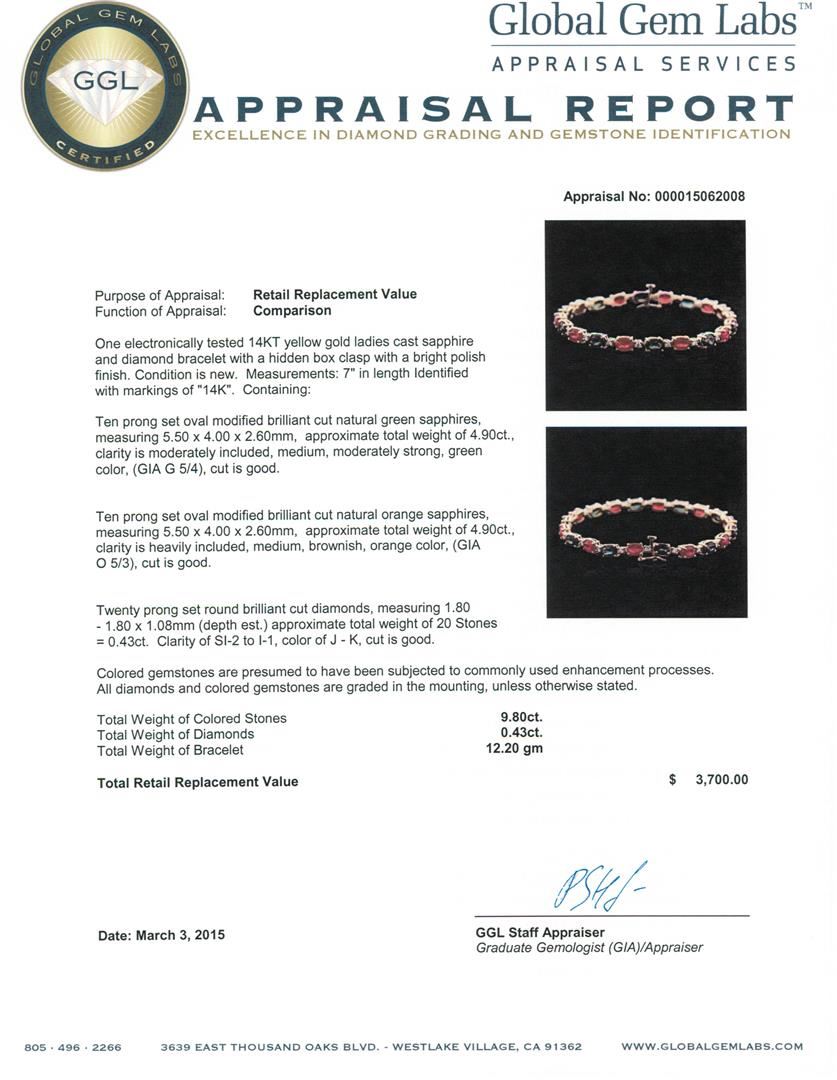 One electronically tested 14KT yellow gold ladies cast sapphire and diamond bracelet with a hidden box clasp with a bright polish finish. Measurements: 7" in length Identified with markings of "14K". Condition is new. Containing: Ten prong set oval modified brilliant cut natural green sapphires, measuring 5.50 x 4.00 x 2.60mm, approximate total weight of 4.90ct., clarity is moderately included, medium, moderately strong, green color, (GIA G 5/4), cut is good. Ten prong set oval modified brilliant cut natural orange sapphires, measuring 5.50 x 4.00 x 2.60mm, approximate total weight of 4.90ct., clarity is heavily included, medium, brownish, orange color, (GIA O 5/3), cut is good. Twenty prong set round brilliant cut diamonds, measuring 1.80 - 1.80 x 1.08mm (depth est.) approximate total weight of 20 Stones = 0.43ct. Clarity: SI-2 to I-1. Color: J - K, Cut is Good. Colored gemstones are presumed to have been subjected to commonly used enhancement processes. All diamonds and colored gemstones are graded in the mounting, unless otherwise stated. Total Weight of Colored Stones 9.80ct. Total Weight of Diamonds 0.43ct. Total Weight of Bracelet 12.20 grams. GGL Appraised at $3,700.00.