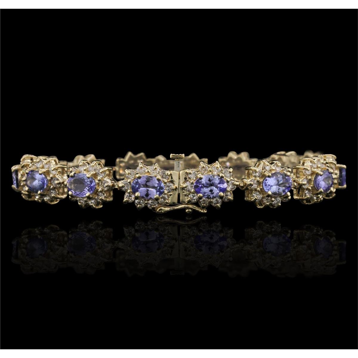 One electronically tested 14KT yellow gold ladies cast & assembled tanzanite and diamond bracelet. Condition is new, good workmanship. Seven and one-quarter inch length bracelet features a flexible tanzanite and diamond floret ribbon, terminating in a concealed clasp with safety. Bright polish finish. Identified with markings of "14K". Containing: Fourteen prong set oval mixed cut natural tanzanites, measuring 6.80 x 4.80 x 3.10mm, approximate. Total Weight of 9.90ct., clarity is eye clean, type I, medium dark, very slightly grayish, bluish violet color, (GIA bV 6/3), cut is good. Transmitting light with no distortion, transparent. Measurements & the color grade are an average for the group. Graded in the setting. Tanzanite is a very rare gemstone that is only found in the country of Tanzania. Originally discovered in 1967. Tiffany & Company, named the stone Tanzanite. It is found in the Usumburu Mountains that border the Umba Valley of northern Tanzania. Tanzanite occurs in gray, brown, violet, blue, reddish-purple, & green. The gem is interesting because of its exceptional pleochroism. Rotated in different directions a tanzanite will exhibit multiple changes of color. Tanzanite has a low tolerance to ultrasonic cleaning, and should not be cleaned using this method. One Hundred Forty prong set round brilliant cut diamonds, measuring 2.10 - 2.00 x 1.23mm (depth est.) approximate. Total Weight of 140 Stones = 4.51ct. Graded in the setting. Clarity: SI-1 to I-1. Color: H - J. Total Weight of Colored Stones 9.90ct. Total Weight of Diamonds 4.51ct. Total Weight of Bracelet 23.49 grams. AIG Appraised at $23,540.00.