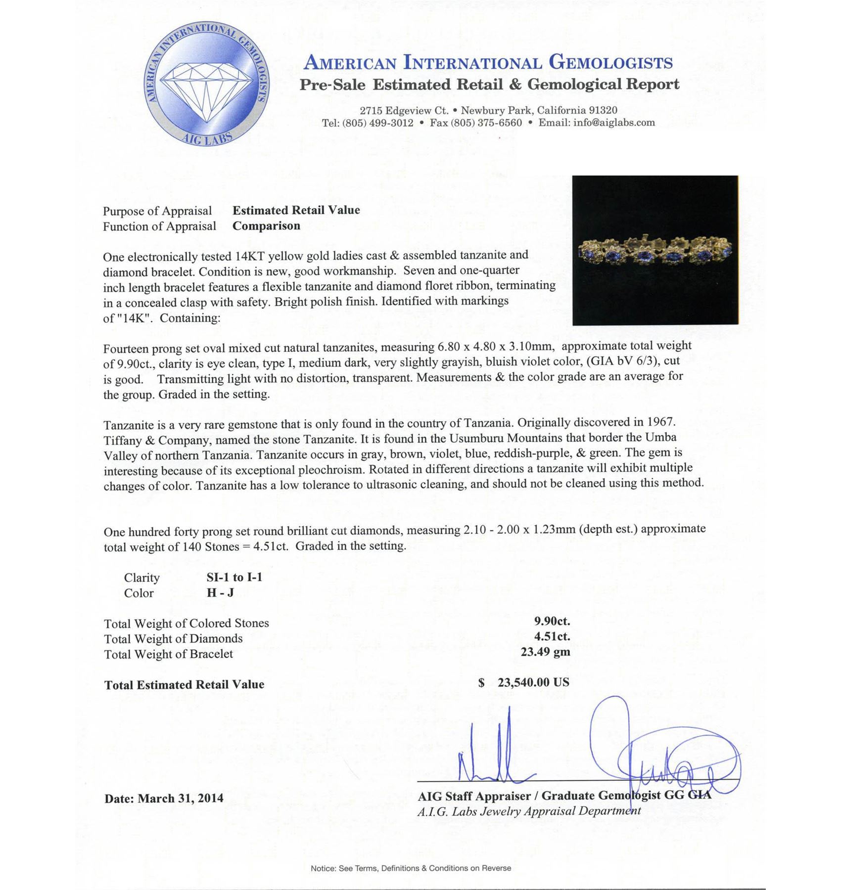One electronically tested 14KT yellow gold ladies cast & assembled tanzanite and diamond bracelet. Condition is new, good workmanship. Seven and one-quarter inch length bracelet features a flexible tanzanite and diamond floret ribbon, terminating in a concealed clasp with safety. Bright polish finish. Identified with markings of "14K". Containing: Fourteen prong set oval mixed cut natural tanzanites, measuring 6.80 x 4.80 x 3.10mm, approximate. Total Weight of 9.90ct., clarity is eye clean, type I, medium dark, very slightly grayish, bluish violet color, (GIA bV 6/3), cut is good. Transmitting light with no distortion, transparent. Measurements & the color grade are an average for the group. Graded in the setting. Tanzanite is a very rare gemstone that is only found in the country of Tanzania. Originally discovered in 1967. Tiffany & Company, named the stone Tanzanite. It is found in the Usumburu Mountains that border the Umba Valley of northern Tanzania. Tanzanite occurs in gray, brown, violet, blue, reddish-purple, & green. The gem is interesting because of its exceptional pleochroism. Rotated in different directions a tanzanite will exhibit multiple changes of color. Tanzanite has a low tolerance to ultrasonic cleaning, and should not be cleaned using this method. One Hundred Forty prong set round brilliant cut diamonds, measuring 2.10 - 2.00 x 1.23mm (depth est.) approximate. Total Weight of 140 Stones = 4.51ct. Graded in the setting. Clarity: SI-1 to I-1. Color: H - J. Total Weight of Colored Stones 9.90ct. Total Weight of Diamonds 4.51ct. Total Weight of Bracelet 23.49 grams.