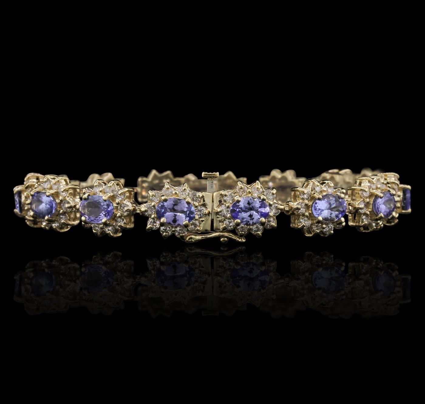 One electronically tested 14KT yellow gold ladies cast & assembled tanzanite and diamond bracelet. Condition is new, good workmanship. Seven and one-quarter inch length bracelet features a flexible tanzanite and diamond floret ribbon, terminating in a concealed clasp with safety. Bright polish finish. Identified with markings of "14K". Containing: Fourteen prong set oval mixed cut natural tanzanites, measuring 6.80 x 4.80 x 3.10mm, approximate. Total Weight of 9.90ct., clarity is eye clean, type I, medium dark, very slightly grayish, bluish violet color, (GIA bV 6/3), cut is good. Transmitting light with no distortion, transparent. Measurements & the color grade are an average for the group. Graded in the setting. Tanzanite is a very rare gemstone that is only found in the country of Tanzania. Originally discovered in 1967. Tiffany & Company, named the stone Tanzanite. It is found in the Usumburu Mountains that border the Umba Valley of northern Tanzania. Tanzanite occurs in gray, brown, violet, blue, reddish-purple, & green. The gem is interesting because of its exceptional pleochroism. Rotated in different directions a tanzanite will exhibit multiple changes of color. Tanzanite has a low tolerance to ultrasonic cleaning, and should not be cleaned using this method. One Hundred Forty prong set round brilliant cut diamonds, measuring 2.10 - 2.00 x 1.23mm (depth est.) approximate. Total Weight of 140 Stones = 4.51ct. Graded in the setting. Clarity: SI-1 to I-1. Color: H - J. Total Weight of Colored Stones 9.90ct. Total Weight of Diamonds 4.51ct. Total Weight of Bracelet 23.49 grams.