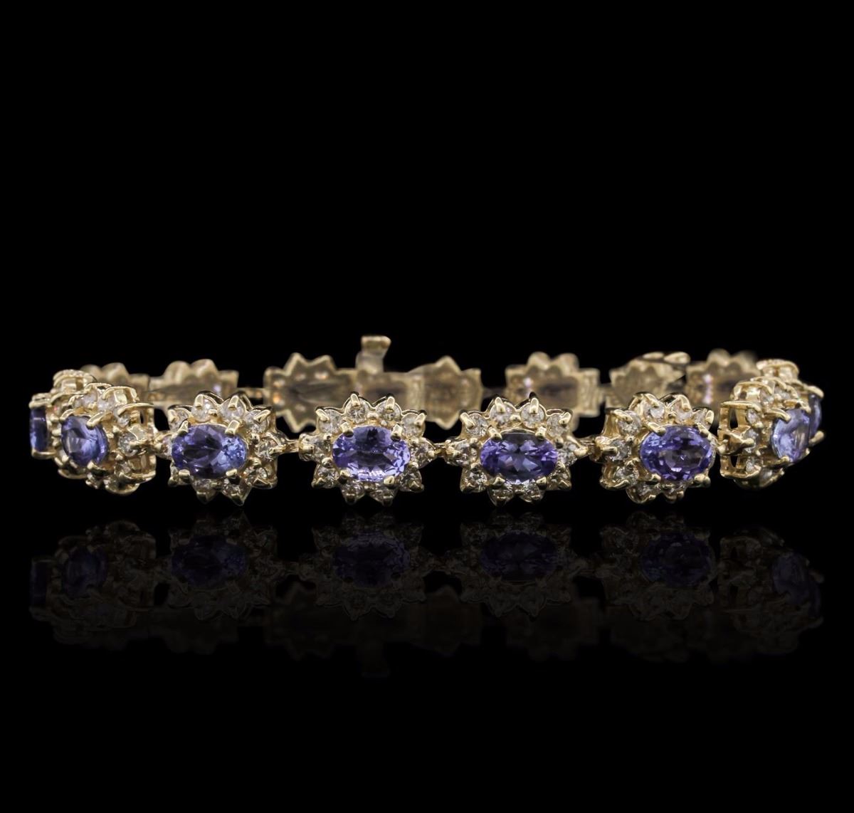 One electronically tested 14KT yellow gold ladies cast & assembled tanzanite and diamond bracelet. Condition is new, good workmanship. Seven and one-quarter inch length bracelet features a flexible tanzanite and diamond floret ribbon, terminating in a concealed clasp with safety. Bright polish finish. Identified with markings of "14K". Containing: Fourteen prong set oval mixed cut natural tanzanites, measuring 6.80 x 4.80 x 3.10mm, approximate. Total Weight of 9.90ct., clarity is eye clean, type I, medium dark, very slightly grayish, bluish violet color, (GIA bV 6/3), cut is good. Transmitting light with no distortion, transparent. Measurements & the color grade are an average for the group. Graded in the setting. Tanzanite is a very rare gemstone that is only found in the country of Tanzania. Originally discovered in 1967. Tiffany & Company, named the stone Tanzanite. It is found in the Usumburu Mountains that border the Umba Valley of northern Tanzania. Tanzanite occurs in gray, brown, violet, blue, reddish-purple, & green. The gem is interesting because of its exceptional pleochroism. Rotated in different directions a tanzanite will exhibit multiple changes of color. Tanzanite has a low tolerance to ultrasonic cleaning, and should not be cleaned using this method. One Hundred Forty prong set round brilliant cut diamonds, measuring 2.10 - 2.00 x 1.23mm (depth est.) approximate. Total Weight of 140 Stones = 4.51ct. Graded in the setting. Clarity: SI-1 to I-1. Color: H - J. Total Weight of Colored Stones 9.90ct. Total Weight of Diamonds 4.51ct. Total Weight of Bracelet 23.49 grams. AIG Appraised at $23,540.00.