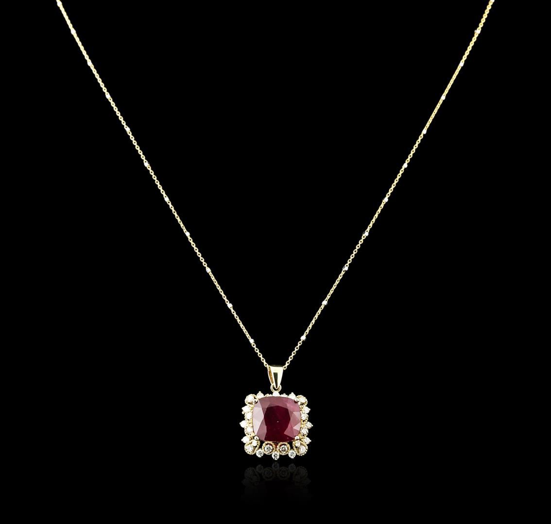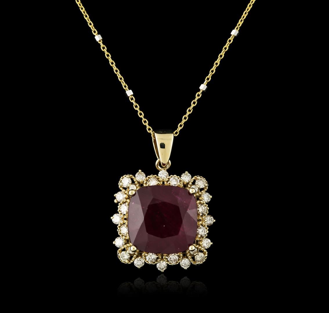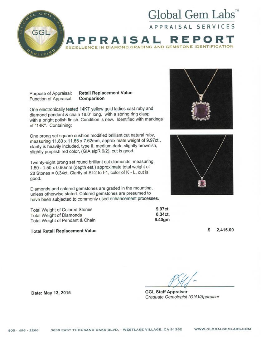 One electronically tested 14KT yellow gold ladies cast ruby and diamond pendant & chain 18.0" long, with a spring ring clasp with a bright polish finish. Identified with markings of "14K". Condition is new. Containing: One prong set square cushion modified brilliant cut natural ruby, measuring 11.80 x 11.65 x 7.62mm, approximate weight of 9.97ct., clarity is heavily included, type II, medium dark, slightly brownish, slightly purplish red color, (GIA slpR 6/2), cut is good. Twenty-Eight prong set round brilliant cut diamonds, measuring 1.50 - 1.50 x 0.90mm (depth est.) approximate total weight of 28 Stones = 0.34ct. Clarity: SI-2 to I-1. Color: K - L, Cut is Good. Diamonds and colored gemstones are graded in the mounting, unless otherwise stated. Colored gemstones are presumed to have been subjected to commonly used enhancement processes. Total Weight of Colored Stones 9.97ct. Total Weight of Diamonds 0.34ct. Total Weight of Pendant & Chain 6.40 grams. GGL Appraised at $2,415.00.