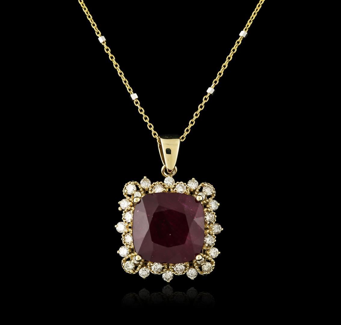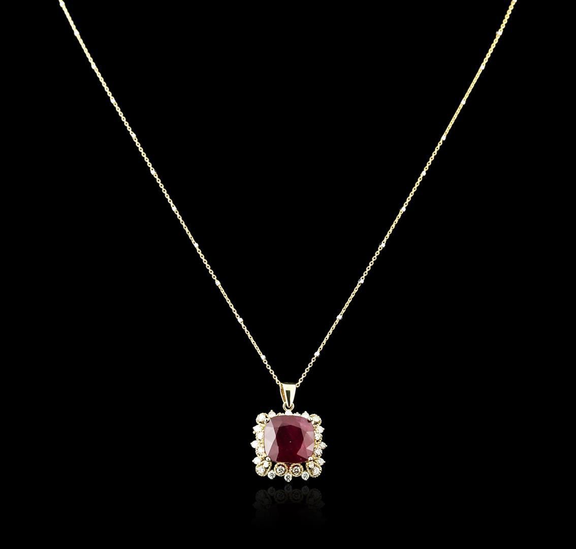 One electronically tested 14KT yellow gold ladies cast ruby and diamond pendant & chain 18.0" long, with a spring ring clasp with a bright polish finish. Identified with markings of "14K". Condition is new. Containing: One prong set square cushion modified brilliant cut natural ruby, measuring 11.80 x 11.65 x 7.62mm, approximate weight of 9.97ct., clarity is heavily included, type II, medium dark, slightly brownish, slightly purplish red color, (GIA slpR 6/2), cut is good. Twenty-Eight prong set round brilliant cut diamonds, measuring 1.50 - 1.50 x 0.90mm (depth est.) approximate total weight of 28 Stones = 0.34ct. Clarity: SI-2 to I-1. Color: K - L, Cut is Good. Diamonds and colored gemstones are graded in the mounting, unless otherwise stated. Colored gemstones are presumed to have been subjected to commonly used enhancement processes. Total Weight of Colored Stones 9.97ct. Total Weight of Diamonds 0.34ct. Total Weight of Pendant & Chain 6.40 grams. GGL Appraised.