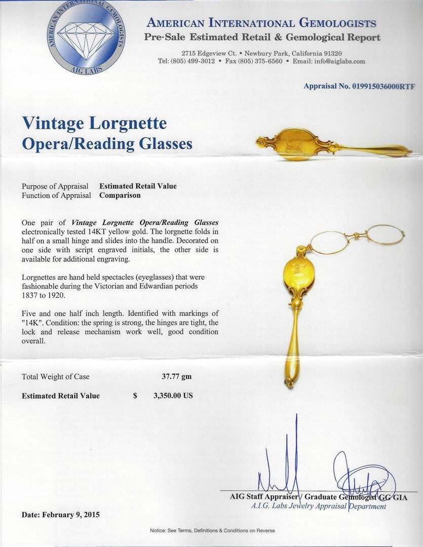 One pair of Vintage Lorgnette Opera/Reading Glasses electronically tested 14KT yellow gold. The lorgnette folds in half on a small hinge and slides into the handle. Decorated on one side with script engraved initials, the other side is available for additional engraving. Lorgnettes are hand held spectacles (eyeglasses) that were fashionable during the Victorian and Edwardian periods 1837 to 1920. Five and one half inch length. Identified with marking of "14K". Condition: the spring is strong, the hinges are tight, the lock and release mechanism work well, good condition overall. Total weight of case 37.77 grams. AIG Appraised at $3,350.00.