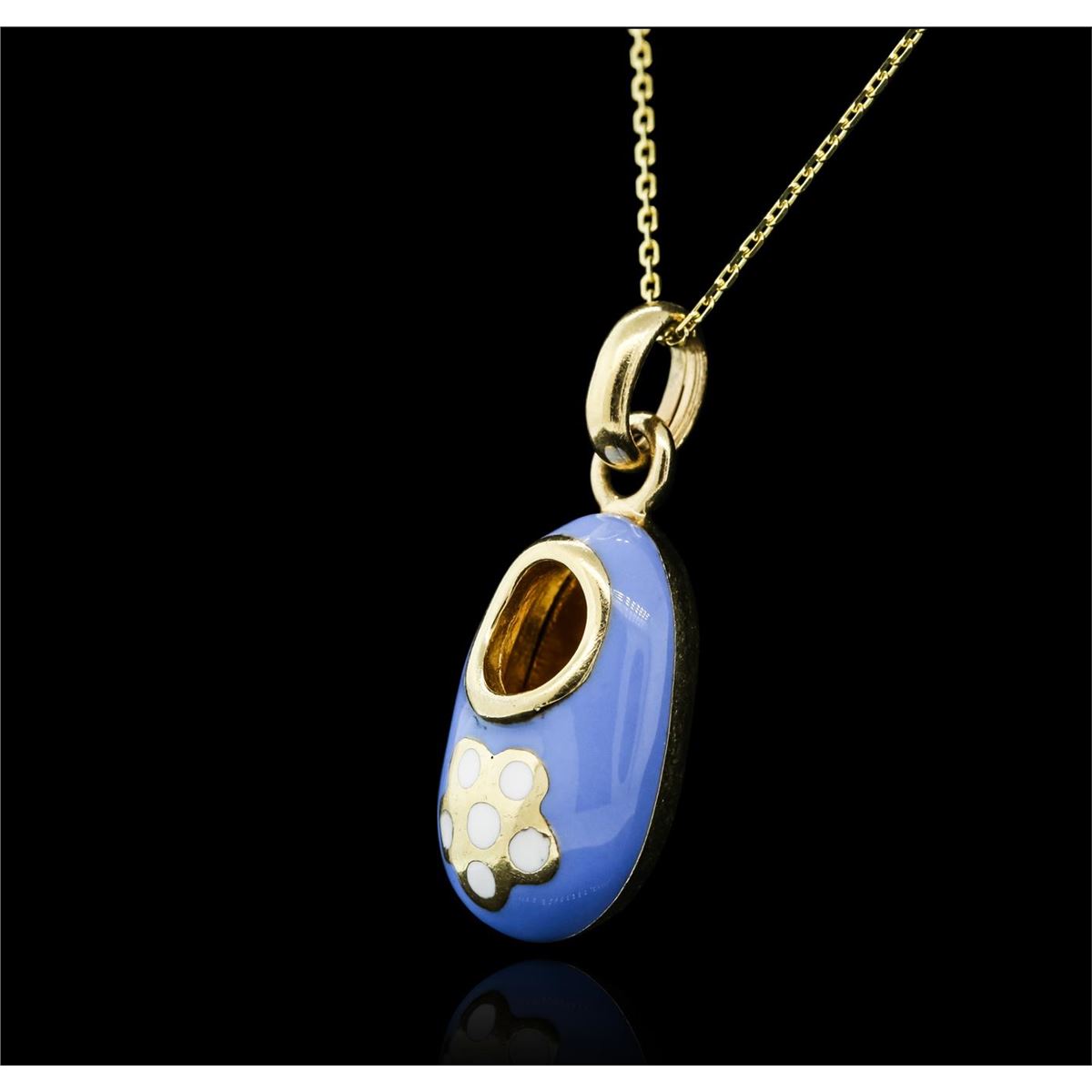 One baby shoe pendant with chain featuring: 14KT yellow gold weighing 3.70 grams.
