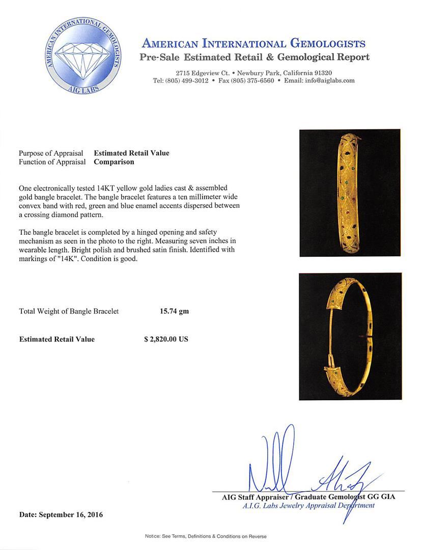 One electronically tested 14KT yellow gold ladies cast & assembled gold bangle bracelet. The seven inch wearable length bangle features a ten millimeter wide convex band with red, green and blue dispersed enamel accents, completed by a hinged opening with a safety mechanism. Bright polish and brushed satin finish. Identified with markings of "14K". Condition is good. Total Weight of Bangle Bracelet 15.74 gm. AIG Appraised at $2,820.00.