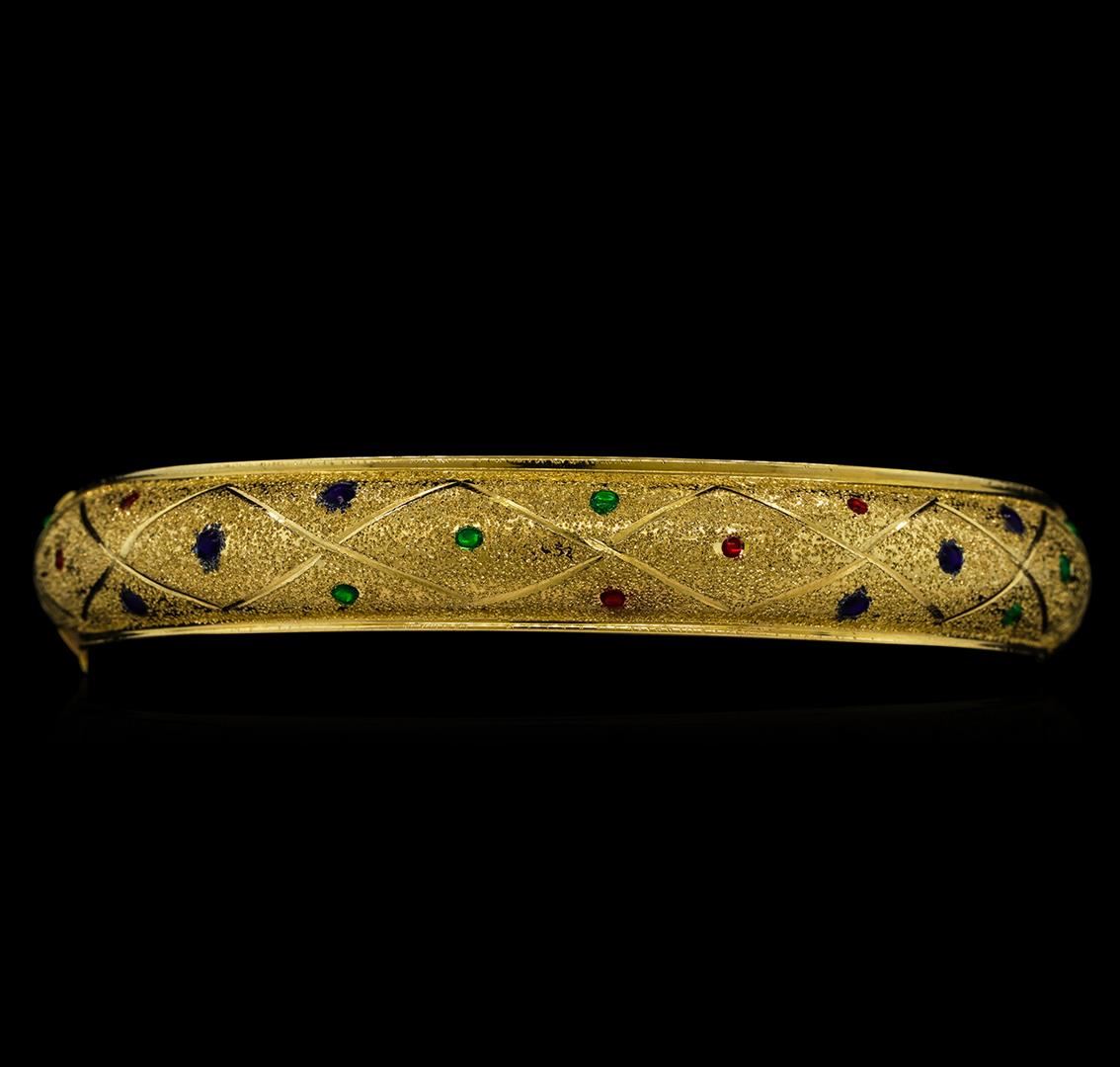 One electronically tested 14KT yellow gold ladies cast & assembled gold bangle bracelet. The seven inch wearable length bangle features a ten millimeter wide convex band with red, green and blue dispersed enamel accents, completed by a hinged opening with a safety mechanism. Bright polish and brushed satin finish. Identified with markings of "14K". Condition is good. Total Weight of Bangle Bracelet 15.74 gm. AIG Appraised at $2,820.00.
