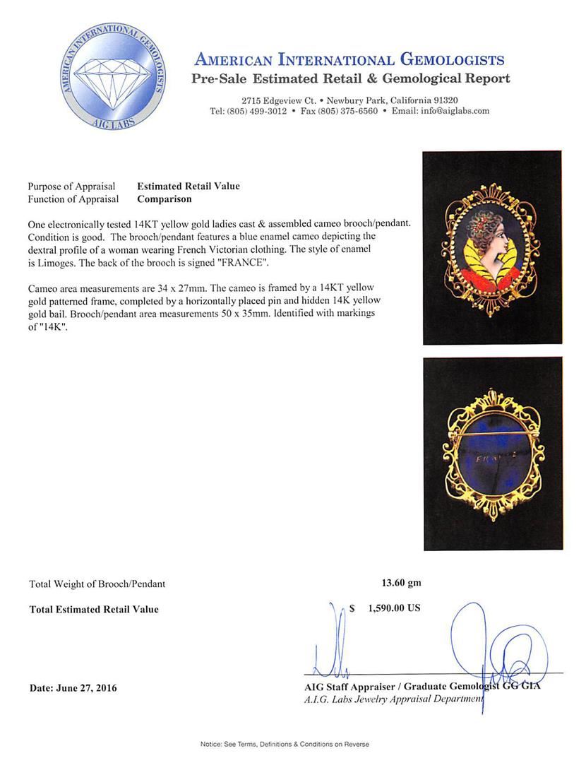 One electronically tested 14KT yellow gold ladies cast & assembled cameo brooch/pendant. The brooch/pendant features a blue enamel cameo depicting the dextral profile of a woman wearing French Victorian clothing. The style of enamel is Limoges. The back of the brooch is signed "FRANCE". Cameo area measurements are 34 x 27mm. The cameo is framed by a 14KT yellow gold patterned frame, completed by a horizontally placed pin and hidden 14K yellow gold bail. Brooch/pendant area measurements 50 x 35mm. Identified with markings of "14K". Condition is good. Total Weight of Brooch/Pendant 13.60gm. AIG Appraised at $1,590.00.
