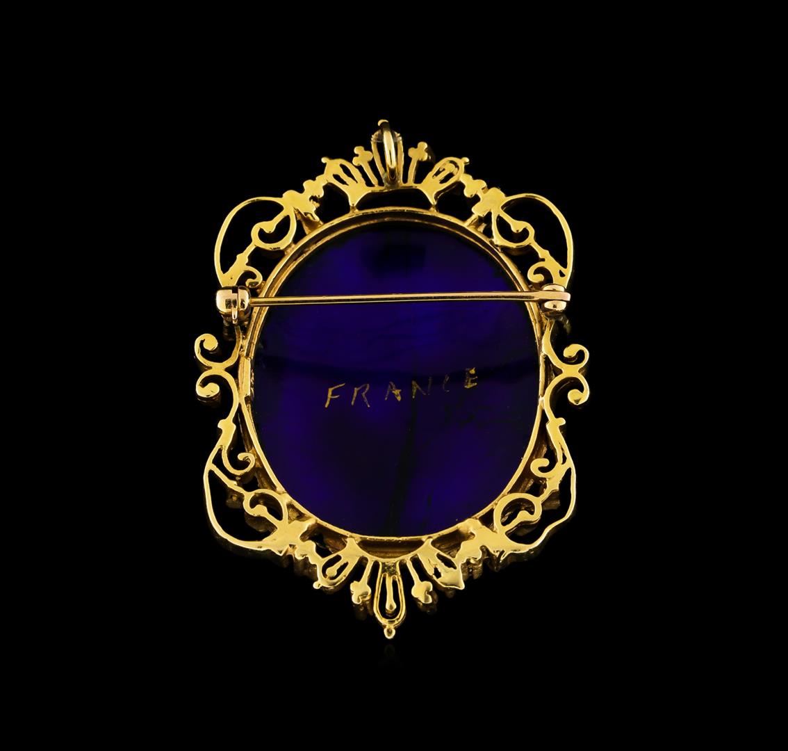 One electronically tested 14KT yellow gold ladies cast & assembled cameo brooch/pendant. The brooch/pendant features a blue enamel cameo depicting the dextral profile of a woman wearing French Victorian clothing. The style of enamel is Limoges. The back of the brooch is signed "FRANCE". Cameo area measurements are 34 x 27mm. The cameo is framed by a 14KT yellow gold patterned frame, completed by a horizontally placed pin and hidden 14K yellow gold bail. Brooch/pendant area measurements 50 x 35mm. Identified with markings of "14K". Condition is good. Total Weight of Brooch/Pendant 13.60gm. AIG Appraised at $1,590.00.