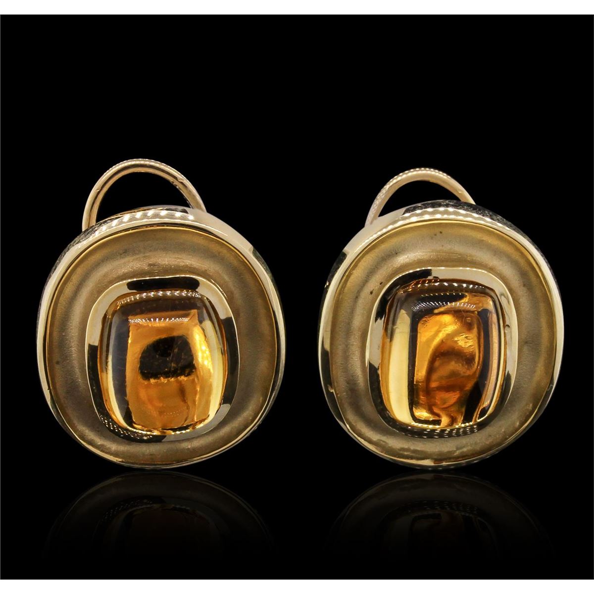 One pair of earrings featuring: 14KT Yellow Gold and Bezel Set Cabachon Citrine. Item weighs 12.10 grams.