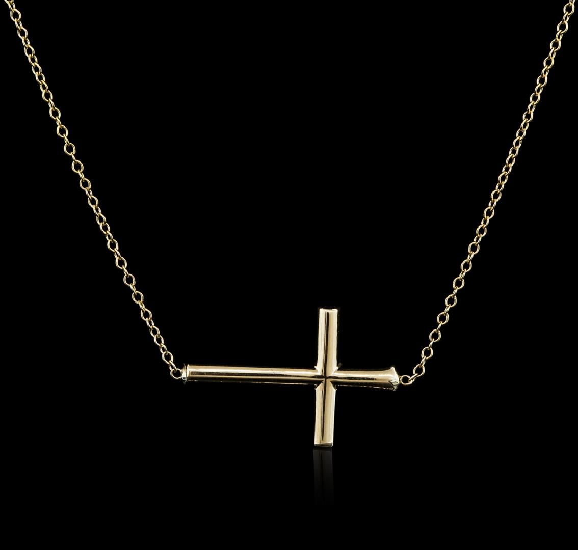 One cross pendant with chain featuring: High polish 14KT yellow gold weighing 1.40 grams.