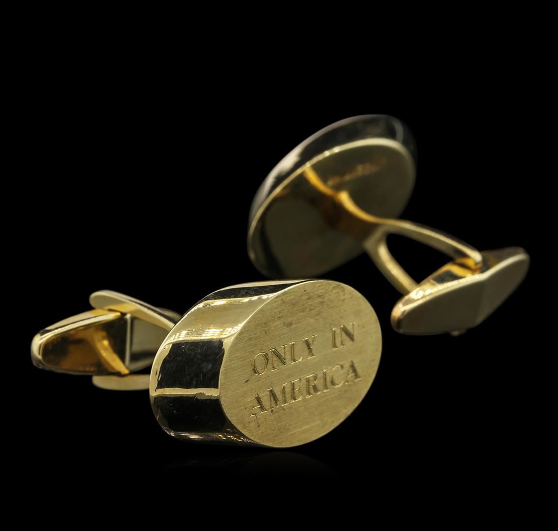 One pair electronically tested 14KT yellow gold gents cast & assembled cufflinks. Condition is good. Each oval shaped cufflink features a flat surface with "ONLY IN AMERICA" engraved in a block font. Bright and satin finish. Trademark is Lindsay. Identified with markings of "14K". Total Weight of Cufflinks: 16.52 gm. AIG Appraised at $2,565.00.