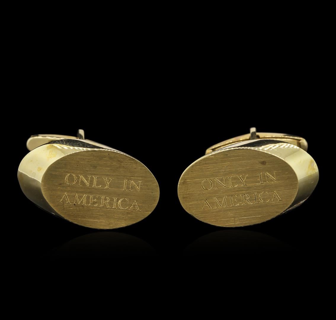One pair electronically tested 14KT yellow gold gents cast & assembled cufflinks. Condition is good. Each oval shaped cufflink features a flat surface with "ONLY IN AMERICA" engraved in a block font. Bright and satin finish. Trademark is Lindsay. Identified with markings of "14K". Total Weight of Cufflinks: 16.52 gm. AIG Appraised at $2,565.00.