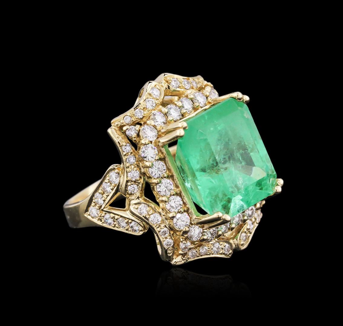 One electronically tested 14KT yellow gold ladies cast emerald and diamond ring with a bright polish finish. Identified with markings of "K14". Condition is new. Containing: One prong set emerald standard step cut natural emerald, measuring 13.13 x 11.92 x 10.47mm, exact weight 10.21ct., clarity is moderately included, type III, medium light, very slightly grayish, green color, (GIA G 4/3), cut is good. GIA Laboratory Report # 5172051824.Sixty-Eight prong set round brilliant cut diamonds, measuring 2.00. - 1.50 x 1.05mm (depth est.) approximate total weight of 68 Stones = 1.33ct. Clarity: SI-1 to SI-2. Color: I - J, Cut is Good. Colored gemstones are presumed to have been subjected to commonly used enhancement processes. All diamonds and colored gemstones are graded in the mounting, unless otherwise stated. Total Weight of Colored Stones 10.21ct. Total Weight of Diamonds 1.33ct. Total Weight of Ring 13.20 grams. GGL Appraised at $13,860.00.