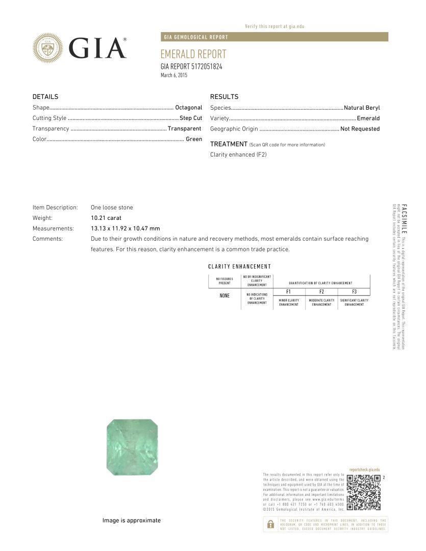 One electronically tested 14KT yellow gold ladies cast emerald and diamond ring with a bright polish finish. Identified with markings of "K14". Condition is new. Containing: One prong set emerald standard step cut natural emerald, measuring 13.13 x 11.92 x 10.47mm, exact weight 10.21ct., clarity is moderately included, type III, medium light, very slightly grayish, green color, (GIA G 4/3), cut is good. GIA Laboratory Report # 5172051824.Sixty-Eight prong set round brilliant cut diamonds, measuring 2.00. - 1.50 x 1.05mm (depth est.) approximate total weight of 68 Stones = 1.33ct. Clarity: SI-1 to SI-2. Color: I - J, Cut is Good. Colored gemstones are presumed to have been subjected to commonly used enhancement processes. All diamonds and colored gemstones are graded in the mounting, unless otherwise stated. Total Weight of Colored Stones 10.21ct. Total Weight of Diamonds 1.33ct. Total Weight of Ring 13.20 grams. GGL Appraised at $13,860.00.