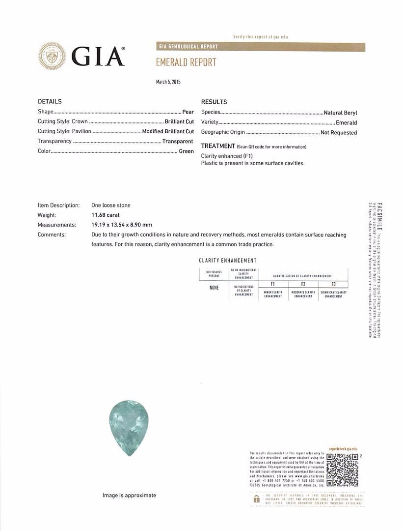 One electronically tested 14KT yellow gold ladies cast emerald, sapphire and diamond ring with a bright polish finish. The featured emerald is set within a stylized sapphire and diamond bezel, completed by a five millimeter wide band. Identified with markings of "K14". Condition is new, good workmanship. Containing: One prong set pear modified brilliant cut natural emerald, measuring 19.19 x 13.54 x 8.90mm, exact weight 11.68ct., clarity is heavily included, type III, medium dark, very slightly grayish, green color, (GIA G 6/3), cut is good. Transmitting light with a minimum of distortion, transparent. Naturally occurring internal & external characteristics are present. Minor clarity enhancement. Plastic is present in some surface cavities. GIA Gemological Report attached. Graded loose prior to setting in the GIA Laboratory, Report #1172049253.Twelve prong set round brilliant cut natural blue sapphires, measuring 4.10 - 4.00 x 2.63 mm, approximate total weight of 4.30ct., clarity is eye clean, type II, dark, very slightly grayish, blue color, (GIA B 7/3), cut is good. Transmitting light with no distortion, transparent. Color grade is an average for the group. Graded in the setting. Three prong set round brilliant cut diamonds, measuring 4.10 - 4.00 x 2.43mm (depth est.) approximate total weight of 3 Stones = 0.83ct. Graded in the setting. Clarity: I-1. Color: G - H. Total Weight of Colored Stones 15.98ct. Total Weight of Diamonds 0.83ct. Total Weight of Ring 16.14 grams. AIG Appraised at $29,185.00.