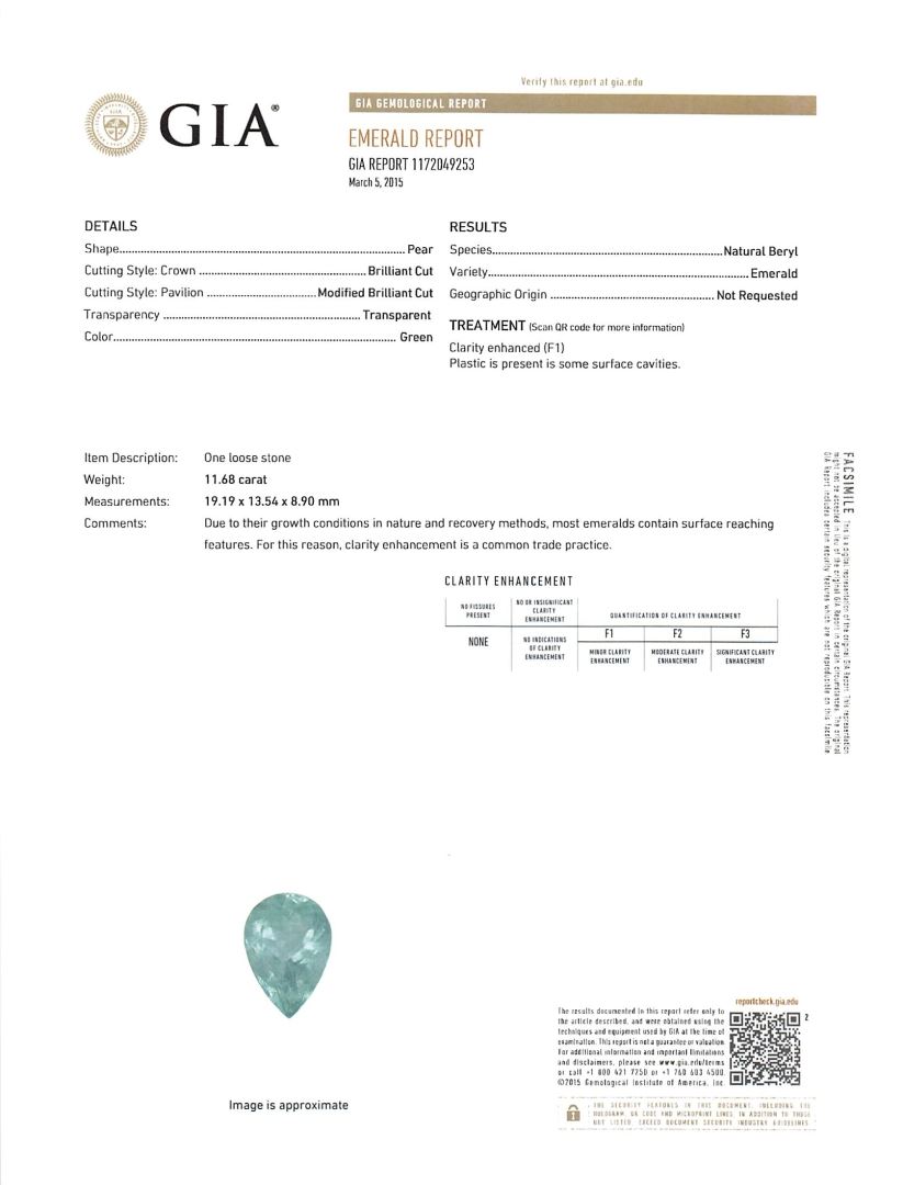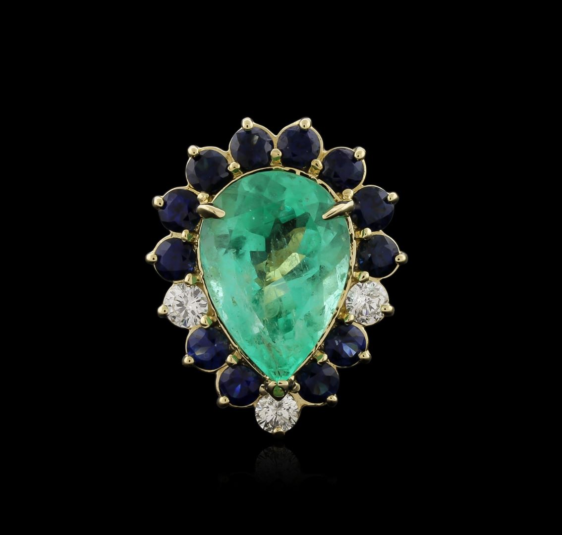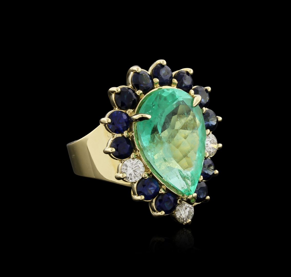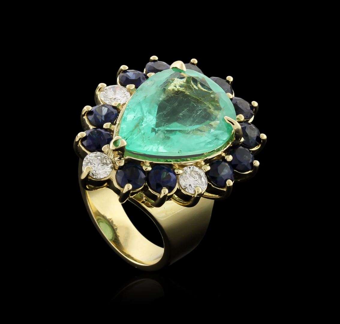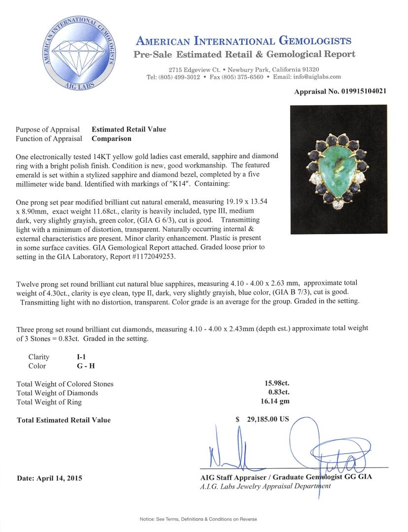 One electronically tested 14KT yellow gold ladies cast emerald, sapphire and diamond ring with a bright polish finish. The featured emerald is set within a stylized sapphire and diamond bezel, completed by a five millimeter wide band. Identified with markings of "K14". Condition is new, good workmanship. Containing: One prong set pear modified brilliant cut natural emerald, measuring 19.19 x 13.54 x 8.90mm, exact weight 11.68ct., clarity is heavily included, type III, medium dark, very slightly grayish, green color, (GIA G 6/3), cut is good. Transmitting light with a minimum of distortion, transparent. Naturally occurring internal & external characteristics are present. Minor clarity enhancement. Plastic is present in some surface cavities. GIA Gemological Report attached. Graded loose prior to setting in the GIA Laboratory, Report #1172049253.Twelve prong set round brilliant cut natural blue sapphires, measuring 4.10 - 4.00 x 2.63 mm, approximate total weight of 4.30ct., clarity is eye clean, type II, dark, very slightly grayish, blue color, (GIA B 7/3), cut is good. Transmitting light with no distortion, transparent. Color grade is an average for the group. Graded in the setting. Three prong set round brilliant cut diamonds, measuring 4.10 - 4.00 x 2.43mm (depth est.) approximate total weight of 3 Stones = 0.83ct. Graded in the setting. Clarity: I-1. Color: G - H. Total Weight of Colored Stones 15.98ct. Total Weight of Diamonds 0.83ct. Total Weight of Ring 16.14 grams. AIG Appraised at $29,185.00.