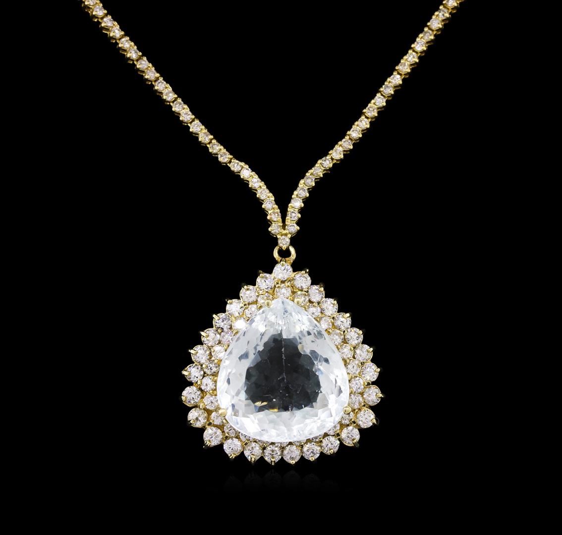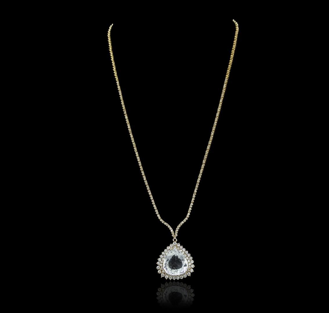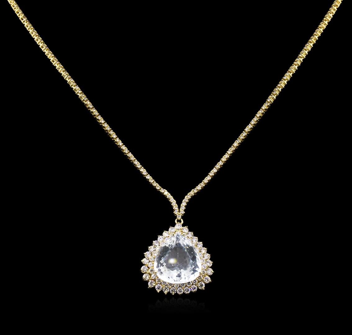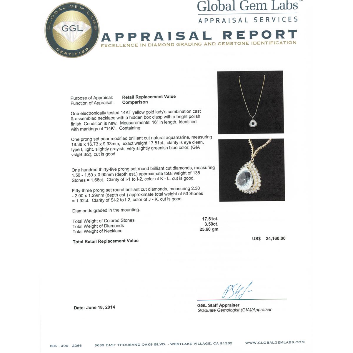 One electronically tested 14KT yellow gold Ladies combination cast & assembled necklace with a hidden box clasp with a bright polish finish. Condition is new. Measurements: 16" in length. Identified with markings of "14K". Containing: One prong set pear modified brilliant cut natural aquamarine, measuring 18.38 x 16.73 x 9.93mm, exact weight 17.51ct., clarity is eye clean, type I, light, slightly grayish, very slightly greenish blue color, (GIA vslgB 3/2), cut is good. GIA Report: 2151952760.One Hundred Thirty-Five prong set round brilliant cut diamonds, measuring 1.50 - 1.50 x 0.90mm (depth est.) approximate. Total Weight of 135 Stones = 1.66ct. Clarity: I-1 to I-2. Color: K - L, Cut is Good. Fifty-Three prong set round brilliant cut diamonds, measuring 2.30 - 2.00 x 1.29mm (depth est.) approximate. Total Weight of 53 Stones = 1.92ct. Clarity: SI-2 to I-2. Color: J - K, Cut is Good. Diamonds graded in the mounting. Total Weight of Colored Stones 17.51ct. Total Weight of Diamonds 3.59ct. Total Weight of Necklace 25.60 grams. GGL Appraised at $24,160.00.