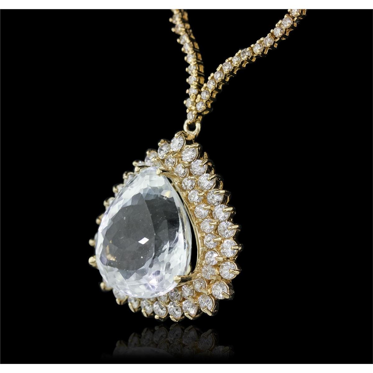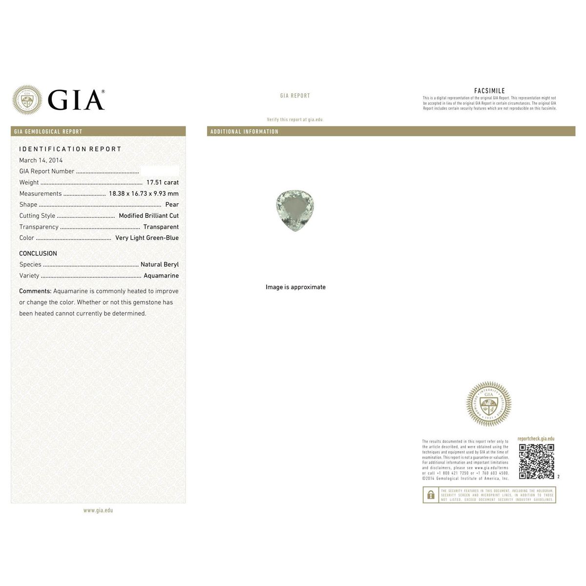 One electronically tested 14KT yellow gold Ladies combination cast & assembled necklace with a hidden box clasp with a bright polish finish. Condition is new. Measurements: 16" in length. Identified with markings of "14K". Containing: One prong set pear modified brilliant cut natural aquamarine, measuring 18.38 x 16.73 x 9.93mm, exact weight 17.51ct., clarity is eye clean, type I, light, slightly grayish, very slightly greenish blue color, (GIA vslgB 3/2), cut is good. GIA Report: 2151952760.One Hundred Thirty-Five prong set round brilliant cut diamonds, measuring 1.50 - 1.50 x 0.90mm (depth est.) approximate. Total Weight of 135 Stones = 1.66ct. Clarity: I-1 to I-2. Color: K - L, Cut is Good. Fifty-Three prong set round brilliant cut diamonds, measuring 2.30 - 2.00 x 1.29mm (depth est.) approximate. Total Weight of 53 Stones = 1.92ct. Clarity: SI-2 to I-2. Color: J - K, Cut is Good. Diamonds graded in the mounting. Total Weight of Colored Stones 17.51ct. Total Weight of Diamonds 3.59ct. Total Weight of Necklace 25.60 grams. GGL Appraised at $24,160.00.