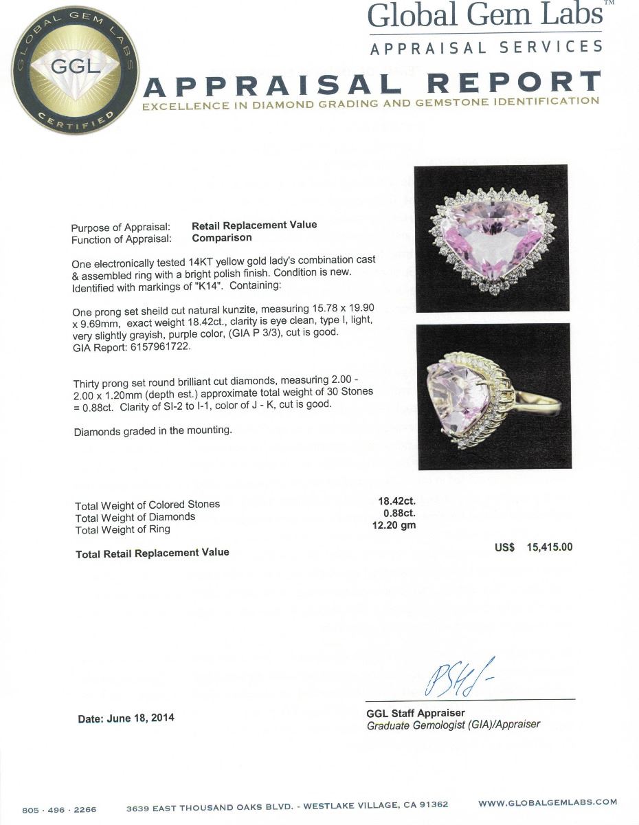 One electronically tested 14KT yellow gold Ladies combination cast & assembled ring with a bright polish finish. Condition is new. Identified with markings of "K14". Containing: One prong set shield cut natural kunzite, measuring 15.78 x 19.90 x 9.69mm, exact weight 18.42ct., clarity is eye clean, type I, light, very slightly grayish, purple color, (GIA P 3/3), cut is good. GIA Report: 6157961722.Thirty prong set round brilliant cut diamonds, measuring 2.00 - 2.00 x 1.20mm (depth est.) approximate. Total Weight of 30 Stones = 0.88ct. Clarity: SI-2 to I-1. Color: J - K, Cut is Good. Diamonds graded in the mounting. Total Weight of Colored Stones 18.42ct. Total Weight of Diamonds 0.88ct. Total Weight of Ring 12.20 grams. GGL Appraised at $15,415.00.