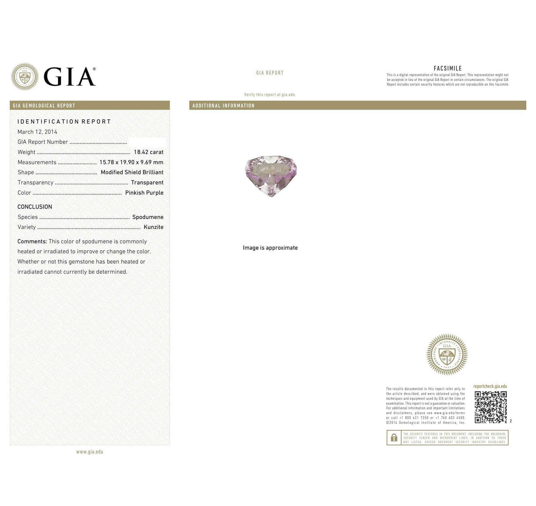 One electronically tested 14KT yellow gold Ladies combination cast & assembled ring with a bright polish finish. Condition is new. Identified with markings of "K14". Containing: One prong set shield cut natural kunzite, measuring 15.78 x 19.90 x 9.69mm, exact weight 18.42ct., clarity is eye clean, type I, light, very slightly grayish, purple color, (GIA P 3/3), cut is good. GIA Report: 6157961722.Thirty prong set round brilliant cut diamonds, measuring 2.00 - 2.00 x 1.20mm (depth est.) approximate. Total Weight of 30 Stones = 0.88ct. Clarity: SI-2 to I-1. Color: J - K, Cut is Good. Diamonds graded in the mounting. Total Weight of Colored Stones 18.42ct. Total Weight of Diamonds 0.88ct. Total Weight of Ring 12.20 grams. GGL Appraised at $15,415.00.