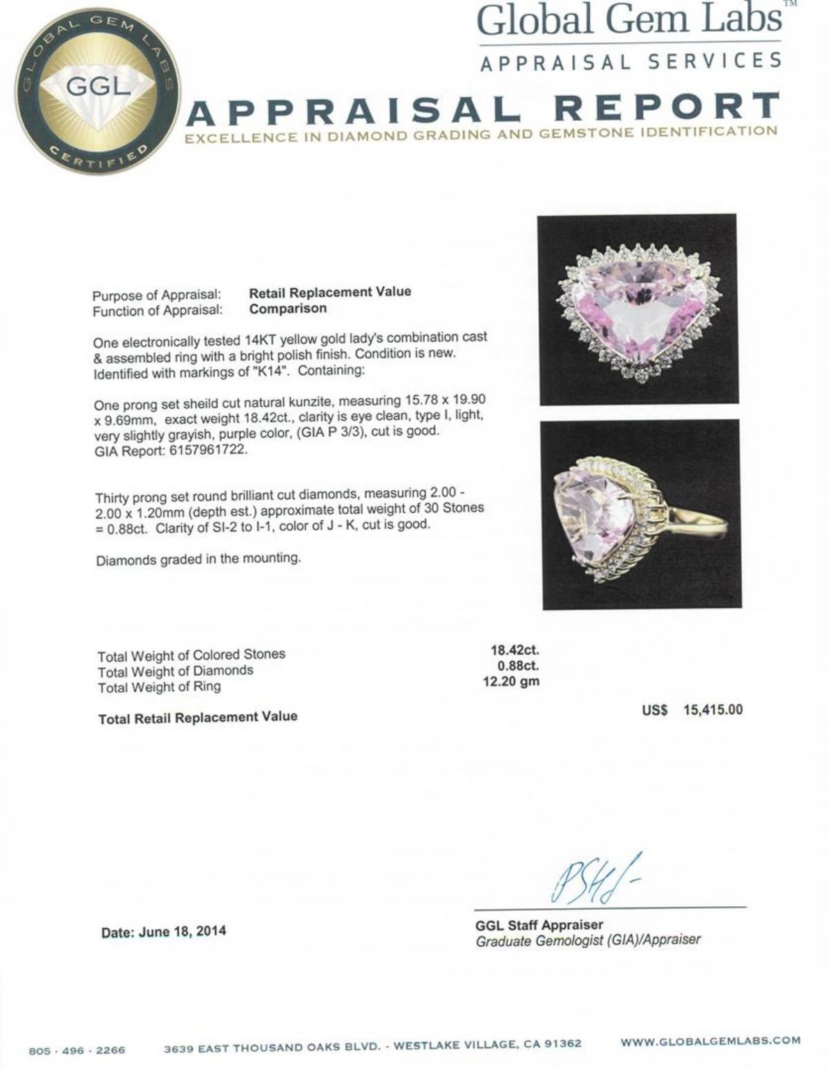 One electronically tested 14KT yellow gold Ladies combination cast & assembled ring with a bright polish finish. Condition is new. Identified with markings of "K14". Containing: One prong set shield cut natural kunzite, measuring 15.78 x 19.90 x 9.69mm, exact weight 18.42ct., clarity is eye clean, type I, light, very slightly grayish, purple color, (GIA P 3/3), cut is good. GIA Report: 6157961722.Thirty prong set round brilliant cut diamonds, measuring 2.00 - 2.00 x 1.20mm (depth est.) approximate. Total Weight of 30 Stones = 0.88ct. Clarity: SI-2 to I-1. Color: J - K, Cut is Good. Diamonds graded in the mounting. Total Weight of Colored Stones 18.42ct. Total Weight of Diamonds 0.88ct. Total Weight of Ring 12.20 grams. GGL Appraised.