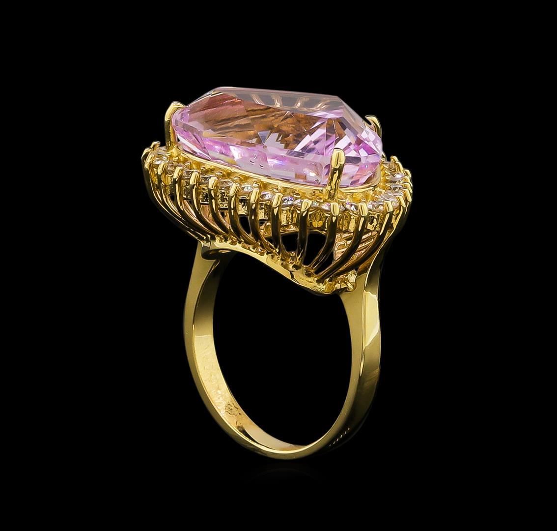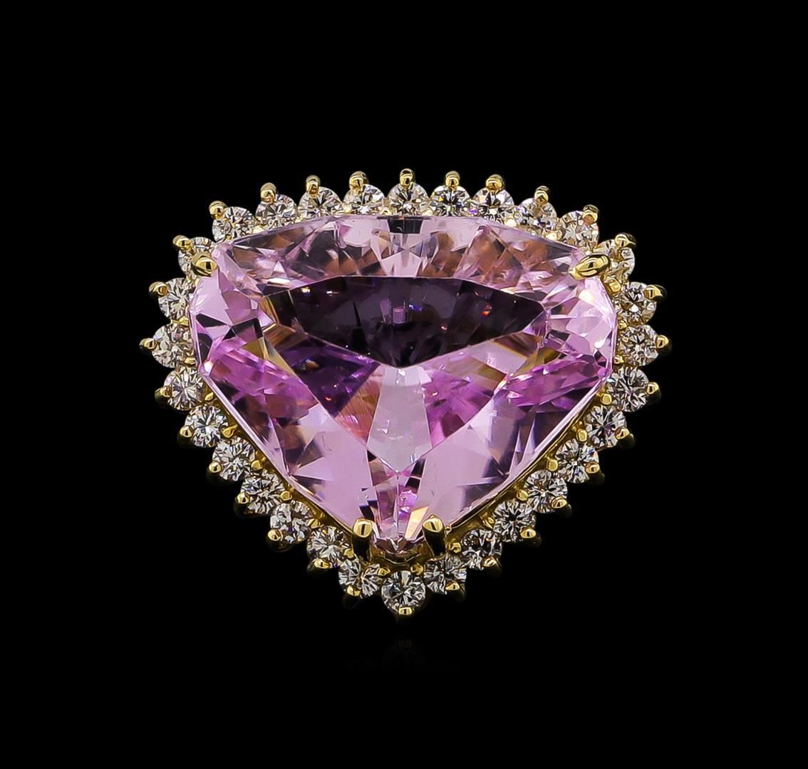 One electronically tested 14KT yellow gold Ladies combination cast & assembled ring with a bright polish finish. Condition is new. Identified with markings of "K14". Containing: One prong set shield cut natural kunzite, measuring 15.78 x 19.90 x 9.69mm, exact weight 18.42ct., clarity is eye clean, type I, light, very slightly grayish, purple color, (GIA P 3/3), cut is good. GIA Report: 6157961722.Thirty prong set round brilliant cut diamonds, measuring 2.00 - 2.00 x 1.20mm (depth est.) approximate. Total Weight of 30 Stones = 0.88ct. Clarity: SI-2 to I-1. Color: J - K, Cut is Good. Diamonds graded in the mounting. Total Weight of Colored Stones 18.42ct. Total Weight of Diamonds 0.88ct. Total Weight of Ring 12.20 grams. GGL Appraised.