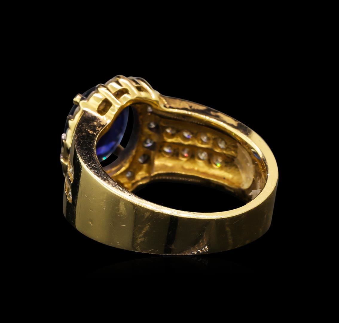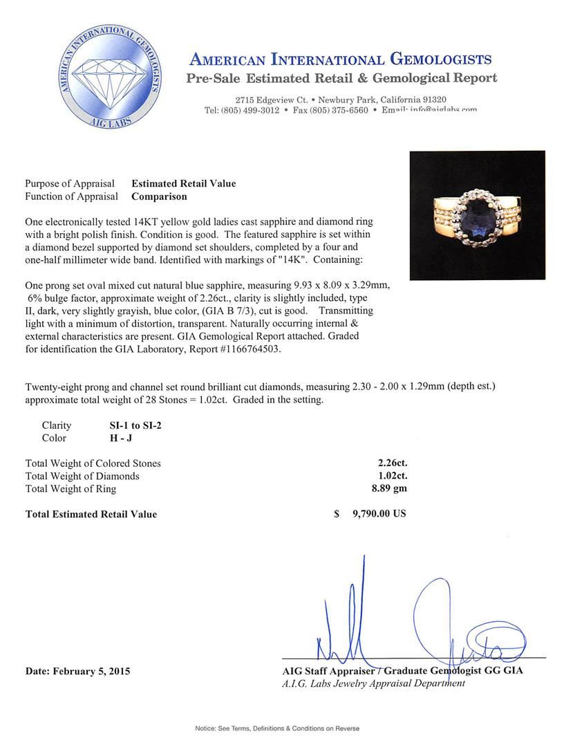 One electronically tested 14KT yellow gold ladies cast sapphire and diamond ring with a bright polish finish. The featured sapphire is set within a diamond bezel supported by diamond set shoulders, completed by a four and one-half millimeter wide band. Identified with markings of "14K". Condition is good. Containing: One prong set oval mixed cut natural blue sapphire, measuring 9.93 x 8.09 x 3.29mm, 6% bulge factor, approximate weight of 2.26ct., clarity is slightly included, type II, dark, very slightly grayish, blue color, (GIA B 7/3), cut is good. Transmitting light with a minimum of distortion, transparent. Naturally occurring internal & external characteristics are present. GIA Gemological Report attached. Graded for identification the GIA Laboratory, Report #1166764503.Twenty-Eight prong and channel set round brilliant cut diamonds, measuring 2.30 - 2.00 x 1.29mm (depth est.) approximate total weight of 28 Stones = 1.02ct. Graded in the setting. Clarity: SI-1 to SI-2. Color: H - J. Total Weight of Colored Stones 2.26ct. Total Weight of Diamonds 1.02ct. Total Weight of Ring 8.89 grams. AIG Appraised at $9,790.00.