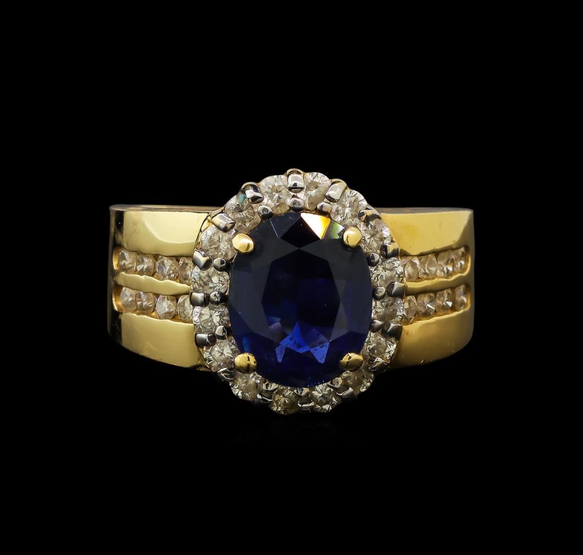 One electronically tested 14KT yellow gold ladies cast sapphire and diamond ring with a bright polish finish. The featured sapphire is set within a diamond bezel supported by diamond set shoulders, completed by a four and one-half millimeter wide band. Identified with markings of "14K". Condition is good. Containing: One prong set oval mixed cut natural blue sapphire, measuring 9.93 x 8.09 x 3.29mm, 6% bulge factor, approximate weight of 2.26ct., clarity is slightly included, type II, dark, very slightly grayish, blue color, (GIA B 7/3), cut is good. Transmitting light with a minimum of distortion, transparent. Naturally occurring internal & external characteristics are present. GIA Gemological Report attached. Graded for identification the GIA Laboratory, Report #1166764503.Twenty-Eight prong and channel set round brilliant cut diamonds, measuring 2.30 - 2.00 x 1.29mm (depth est.) approximate total weight of 28 Stones = 1.02ct. Graded in the setting. Clarity: SI-1 to SI-2. Color: H - J. Total Weight of Colored Stones 2.26ct. Total Weight of Diamonds 1.02ct. Total Weight of Ring 8.89 grams. AIG Appraised at $9,790.00.