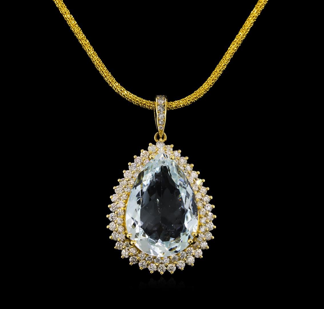 One electronically tested 14KT yellow gold ladies cast & assembled aquamarine and diamond pendant with chain. Condition is new, good workmanship. The pendant features an aquamarine set within a two tiered diamond bezel, completed by a diamond set bail. The pendant is supported by an eighteen inch length 14KT yellow gold woven chain, terminating in a lobster claw clasp. Bright polish finish with milgrain detailing. Identified with markings of "14K". Containing: One prong set pear modified brilliant cut natural aquamarine, measuring 24.69 x 17.18 x 8.67mm, exact weight 20.50ct., clarity is slightly included, type I, very light, very slightly grayish, greenish blue color, (GIA gB 2/3), cut is good. Transmitting light with a minimum of distortion, transparent. Naturally occurring internal & external characteristics are present. GIA Gemological Report attached. Graded loose prior to setting in the GIA Laboratory, Report #2151952801.Seventy-Eight prong set round brilliant cut diamonds, measuring 2.20 - 2.00 x 1.26mm (depth est.) approximate. Total Weight of 78 Stones = 2.74ct. Graded in the setting. Clarity: SI-1 to I-1. Color: G - I. Total Weight of Colored Stones 20.50ct. Total Weight of Diamonds 2.74ct. Total Weight of Pendant With Chain 25.17 grams. AIG Appraised at $19,550.00.