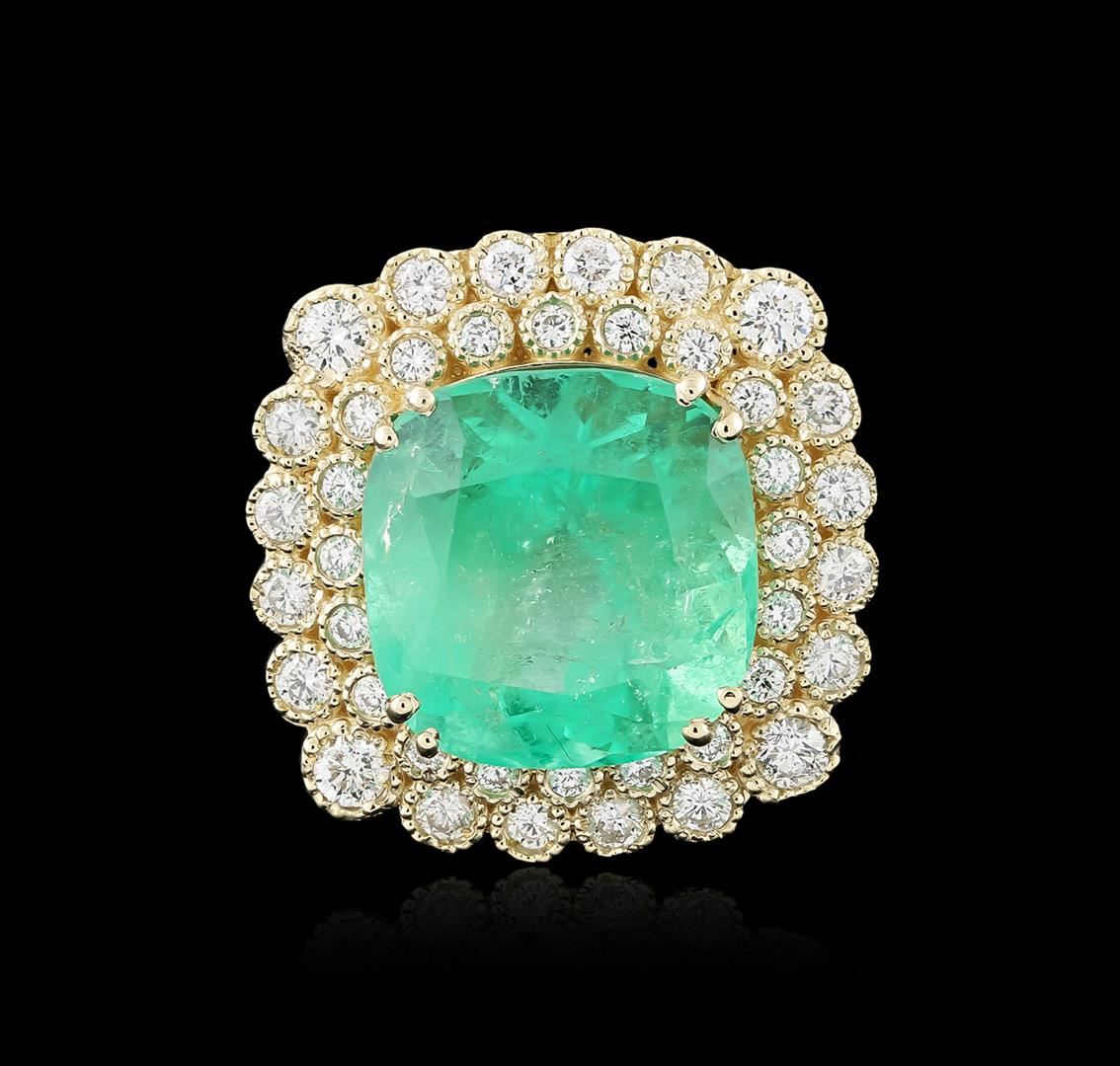 One electronically tested 14KT yellow gold ladies cast emerald and diamond ring with a bright polish finish. Identified with markings of "K14". Condition is new. Containing: One prong set square cushion modified brilliant cut natural emerald, measuring 18.84 x 18.30 x 12.07mm, exact weight 28.07ct., clarity is heavily included, type III, medium light, very slightly grayish, very slightly bluish green color, (GIA vslbG 4/3) Graded loose prior to setting by GIA Gemological Laboratory. GIA report: 1172051637.Forty-Eight prong set round brilliant cut diamonds, measuring 3.10 - 2.00 x 1.53mm (depth est.) approximate total weight of 48 Stones = 2.45ct. Clarity: SI-1 to SI-2. Color: I - J, Cut is Good. Colored gemstones are presumed to have been subjected to commonly used enhancement processes. All diamonds and colored gemstones are graded in the mounting, unless otherwise stated. Total Weight of Colored Stones 28.07ct. Total Weight of Diamonds 2.45ct. Total Weight of Ring 22.30 grams. GGL Appraised at $36,255.00.