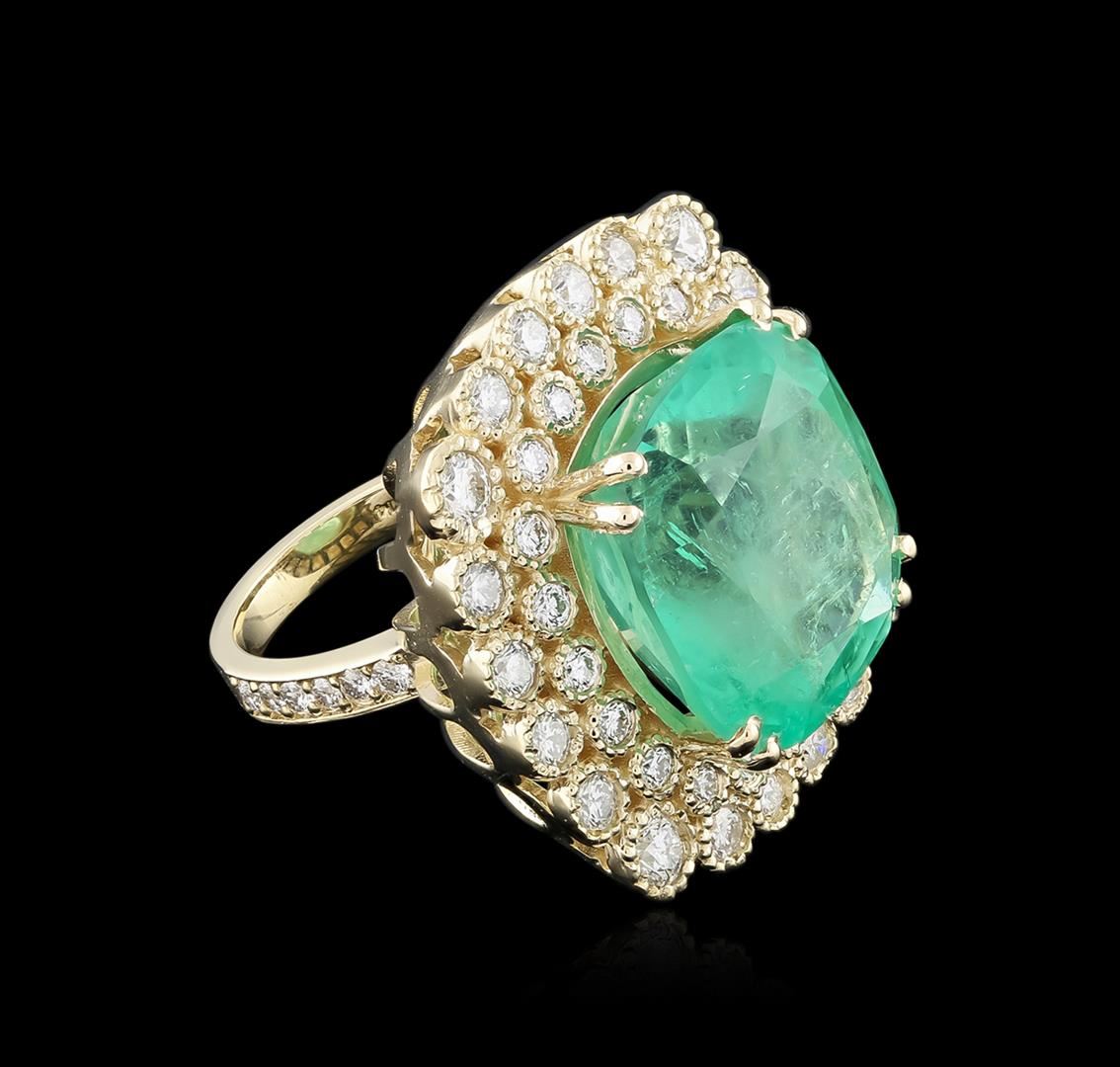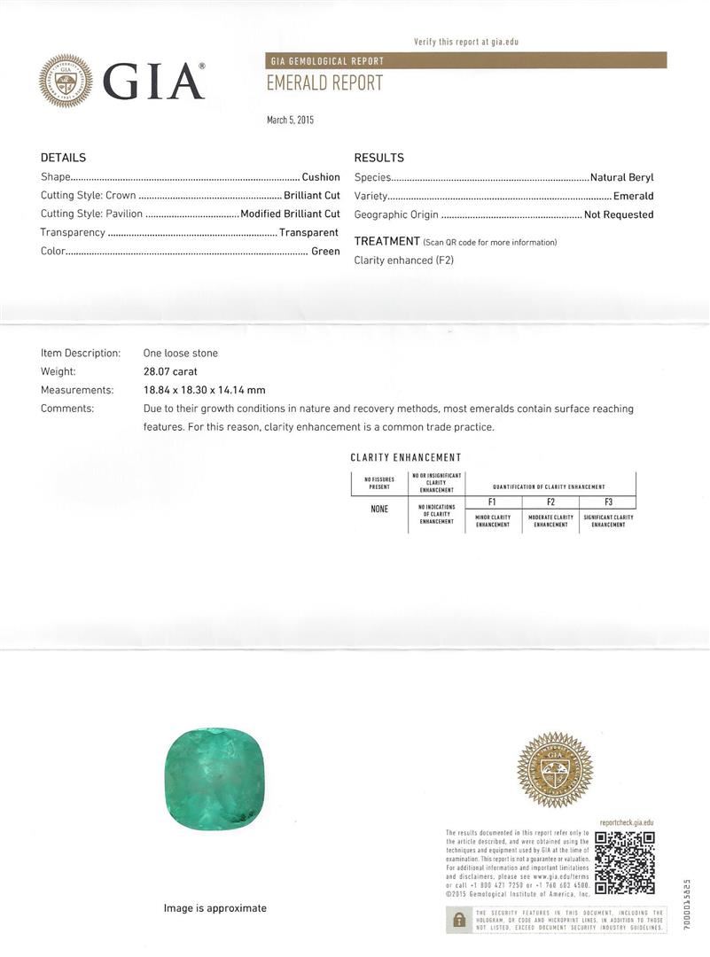 One electronically tested 14KT yellow gold ladies cast emerald and diamond ring with a bright polish finish. Identified with markings of "K14". Condition is new. Containing: One prong set square cushion modified brilliant cut natural emerald, measuring 18.84 x 18.30 x 12.07mm, exact weight 28.07ct., clarity is heavily included, type III, medium light, very slightly grayish, very slightly bluish green color, (GIA vslbG 4/3) Graded loose prior to setting by GIA Gemological Laboratory. GIA report: 1172051637.Forty-Eight prong set round brilliant cut diamonds, measuring 3.10 - 2.00 x 1.53mm (depth est.) approximate total weight of 48 Stones = 2.45ct. Clarity: SI-1 to SI-2. Color: I - J, Cut is Good. Colored gemstones are presumed to have been subjected to commonly used enhancement processes. All diamonds and colored gemstones are graded in the mounting, unless otherwise stated. Total Weight of Colored Stones 28.07ct. Total Weight of Diamonds 2.45ct. Total Weight of Ring 22.30 grams. GGL Appraised at $36,255.00.