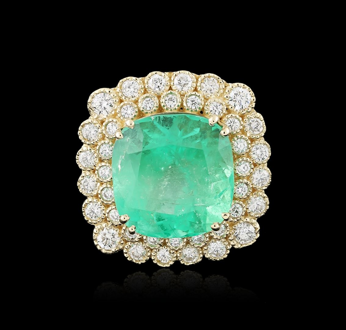 One electronically tested 14KT yellow gold ladies cast emerald and diamond ring with a bright polish finish. Identified with markings of "K14". Condition is new. Containing: One prong set square cushion modified brilliant cut natural emerald, measuring 18.84 x 18.30 x 12.07mm, exact weight 28.07ct., clarity is heavily included, type III, medium light, very slightly grayish, very slightly bluish green color, (GIA vslbG 4/3) Graded loose prior to setting by GIA Gemological Laboratory. GIA report: 1172051637.Forty-Eight prong set round brilliant cut diamonds, measuring 3.10 - 2.00 x 1.53mm (depth est.) approximate total weight of 48 Stones = 2.45ct. Clarity: SI-1 to SI-2. Color: I - J, Cut is Good. Colored gemstones are presumed to have been subjected to commonly used enhancement processes. All diamonds and colored gemstones are graded in the mounting, unless otherwise stated. Total Weight of Colored Stones 28.07ct. Total Weight of Diamonds 2.45ct. Total Weight of Ring 22.30 grams. GGL Appraised at $36,255.00.