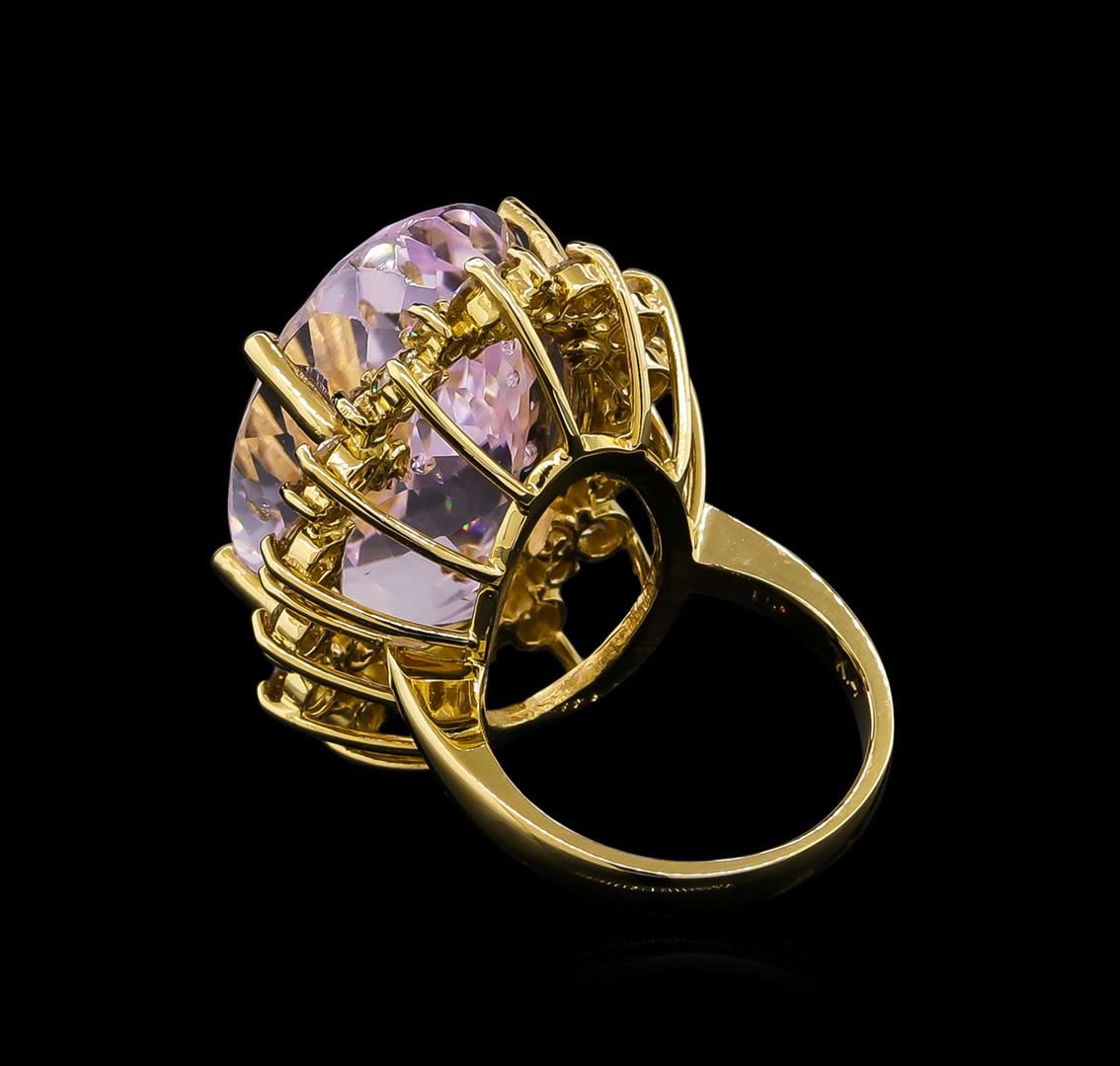 One electronically tested 14KT yellow gold Ladies combination cast & assembled ring with a bright polish finish. Condition is new. Identified with markings of "K14". Containing: One prong set oval modified brilliant cut natural kunzite, measuring 24.27 x 15.67 x 12.17mm, exact weight 37.12ct., clarity is eye clean, light, very slightly grayish, purple color, (GIA P 3/3), cut is good. GIA Report: 615953481.Fourteen prong set round brilliant cut diamonds, measuring 3.00 - 3.00 x 1.80mm (depth est.) approximate. Total Weight of 14 Stones = 1.38ct. Clarity: VS-1 to VS-2. Color: L - M, Cut is Very Good. Fourteen prong set round brilliant cut diamonds, measuring 1.80 - 1.80 x 1.08mm (depth est.) approximate. Total Weight of 14 Stones = 0.30ct. Clarity: VS-2 to SI-1. Color: L - M, Cut is Good. Diamonds graded in the mounting. Total Weight of Colored Stones 37.12ct. Total Weight of Diamonds 1.68ct. Total Weight of Ring 17.40 grams. GGL Appraised at $22,330.00.