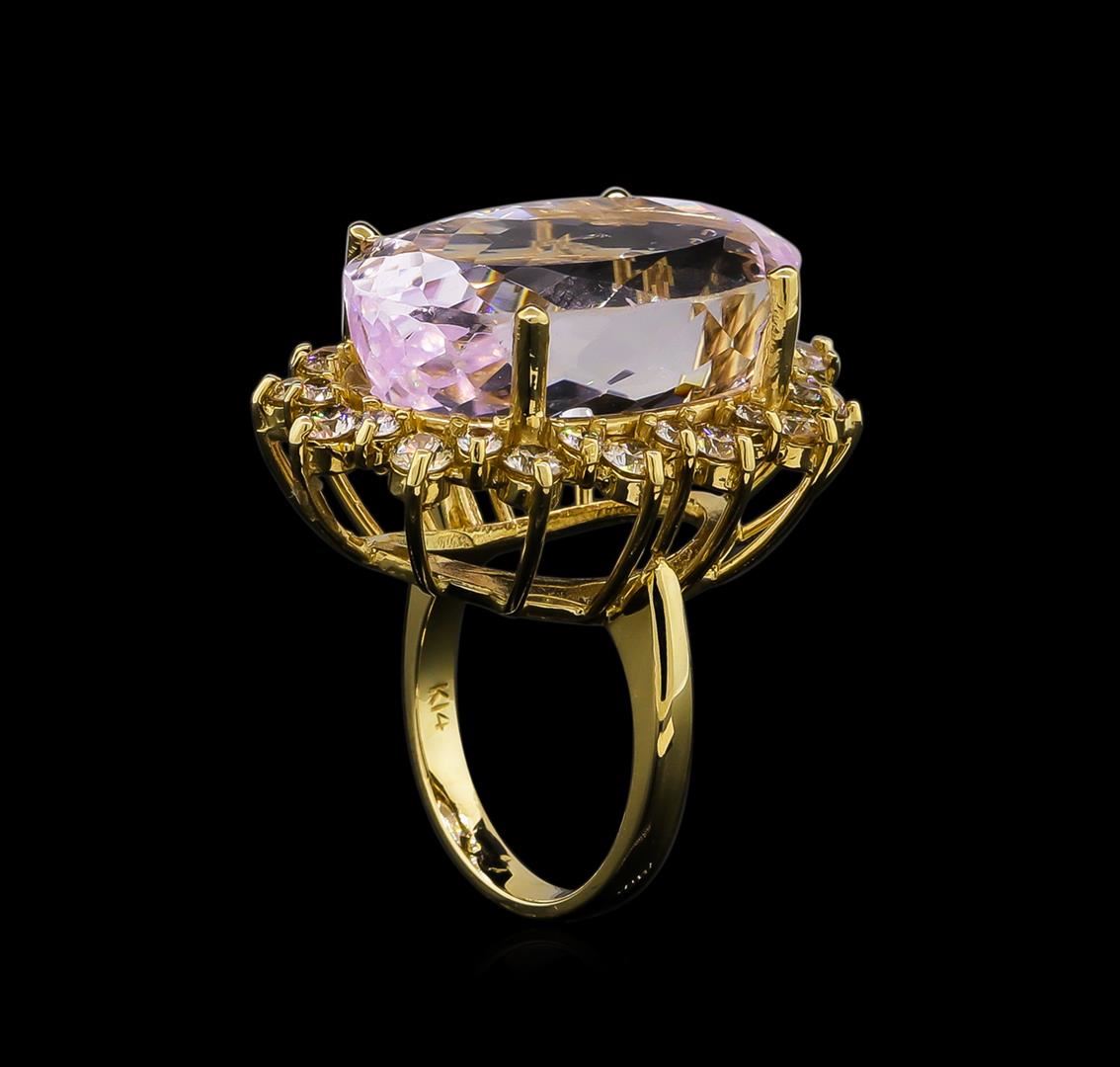 One electronically tested 14KT yellow gold Ladies combination cast & assembled ring with a bright polish finish. Condition is new. Identified with markings of "K14". Containing: One prong set oval modified brilliant cut natural kunzite, measuring 24.27 x 15.67 x 12.17mm, exact weight 37.12ct., clarity is eye clean, light, very slightly grayish, purple color, (GIA P 3/3), cut is good. GIA Report: 615953481.Fourteen prong set round brilliant cut diamonds, measuring 3.00 - 3.00 x 1.80mm (depth est.) approximate. Total Weight of 14 Stones = 1.38ct. Clarity: VS-1 to VS-2. Color: L - M, Cut is Very Good. Fourteen prong set round brilliant cut diamonds, measuring 1.80 - 1.80 x 1.08mm (depth est.) approximate. Total Weight of 14 Stones = 0.30ct. Clarity: VS-2 to SI-1. Color: L - M, Cut is Good. Diamonds graded in the mounting. Total Weight of Colored Stones 37.12ct. Total Weight of Diamonds 1.68ct. Total Weight of Ring 17.40 grams. GGL Appraised at $22,330.00.