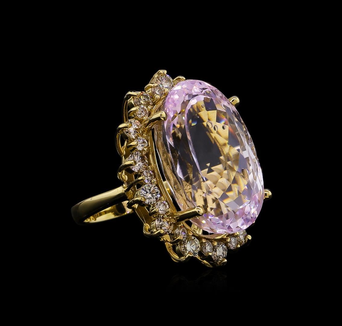 One electronically tested 14KT yellow gold Ladies combination cast & assembled ring with a bright polish finish. Condition is new. Identified with markings of "K14". Containing: One prong set oval modified brilliant cut natural kunzite, measuring 24.27 x 15.67 x 12.17mm, exact weight 37.12ct., clarity is eye clean, light, very slightly grayish, purple color, (GIA P 3/3), cut is good. GIA Report: 615953481.Fourteen prong set round brilliant cut diamonds, measuring 3.00 - 3.00 x 1.80mm (depth est.) approximate. Total Weight of 14 Stones = 1.38ct. Clarity: VS-1 to VS-2. Color: L - M, Cut is Very Good. Fourteen prong set round brilliant cut diamonds, measuring 1.80 - 1.80 x 1.08mm (depth est.) approximate. Total Weight of 14 Stones = 0.30ct. Clarity: VS-2 to SI-1. Color: L - M, Cut is Good. Diamonds graded in the mounting. Total Weight of Colored Stones 37.12ct. Total Weight of Diamonds 1.68ct. Total Weight of Ring 17.40 grams. GGL Appraised at $22,330.00.