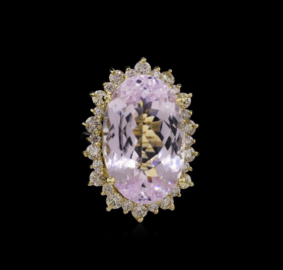 One electronically tested 14KT yellow gold Ladies combination cast & assembled ring with a bright polish finish. Condition is new. Identified with markings of "K14". Containing: One prong set oval modified brilliant cut natural kunzite, measuring 24.27 x 15.67 x 12.17mm, exact weight 37.12ct., clarity is eye clean, light, very slightly grayish, purple color, (GIA P 3/3), cut is good. GIA Report: 615953481.Fourteen prong set round brilliant cut diamonds, measuring 3.00 - 3.00 x 1.80mm (depth est.) approximate. Total Weight of 14 Stones = 1.38ct. Clarity: VS-1 to VS-2. Color: L - M, Cut is Very Good. Fourteen prong set round brilliant cut diamonds, measuring 1.80 - 1.80 x 1.08mm (depth est.) approximate. Total Weight of 14 Stones = 0.30ct. Clarity: VS-2 to SI-1. Color: L - M, Cut is Good. Diamonds graded in the mounting. Total Weight of Colored Stones 37.12ct. Total Weight of Diamonds 1.68ct. Total Weight of Ring 17.40 grams. GGL Appraised at $22,330.00.