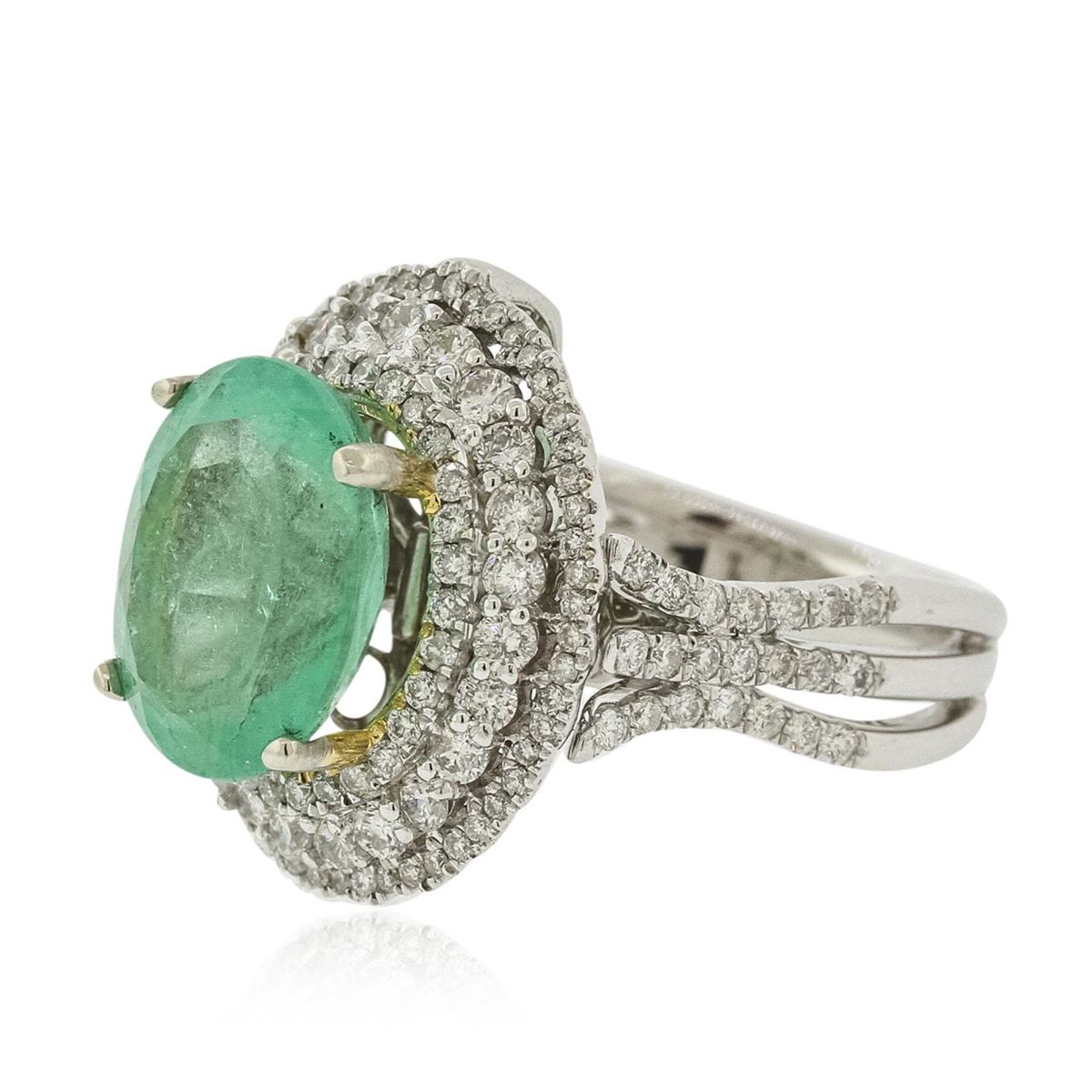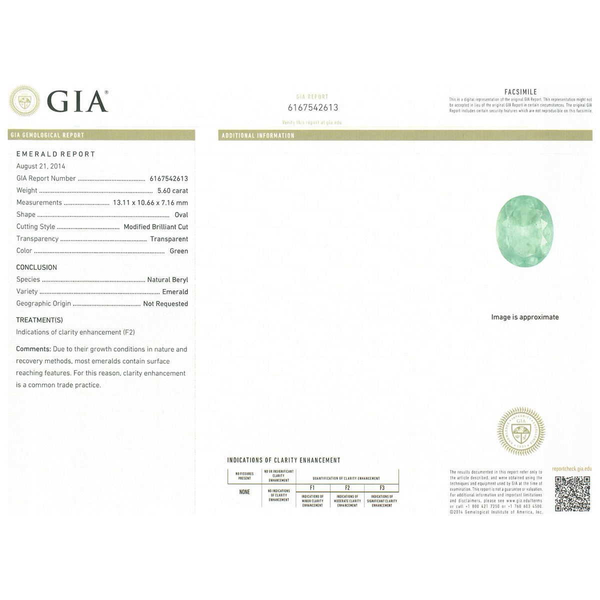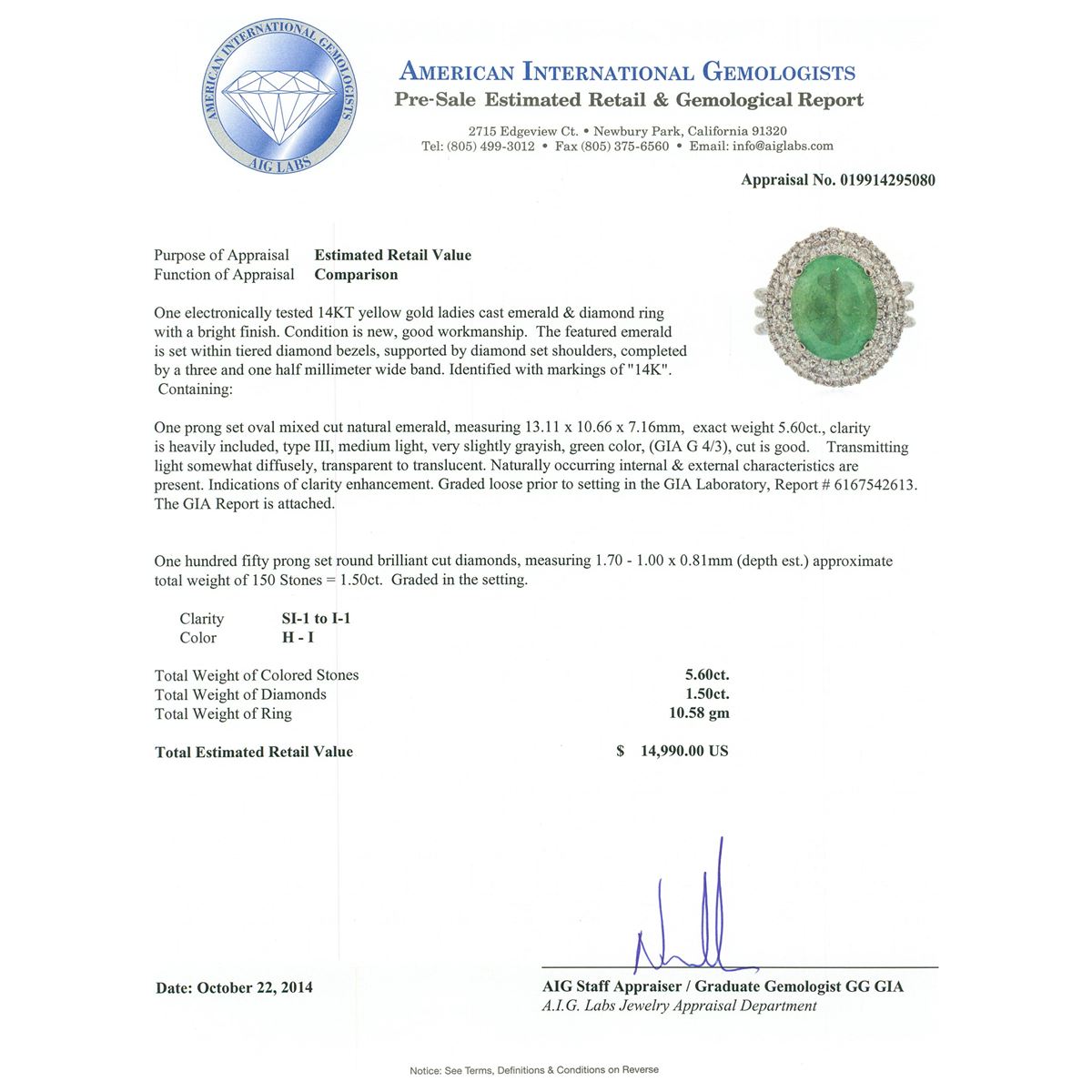 One electronically tested 14KT yellow gold ladies cast emerald & diamond ring with a bright finish. The featured emerald is set within tiered diamond bezels, supported by diamond set shoulders, completed by a three and one half millimeter wide band. Identified with markings of 14K. Condition is new, good workmanship. Containing: One prong set oval mixed cut natural emerald, measuring 13.11 x 10.66 x 7.16mm, exact weight 5.60ct., clarity is heavily included, type III, medium light, very slightly grayish, green color, (GIA G 4/3), cut is good. Transmitting light somewhat diffusely, transparent to translucent. Naturally occurring internal & external characteristics are present. Indications of clarity enhancement. Graded loose prior to setting in the GIA Laboratory, Report # 6167542613. The GIA Report is attached. One Hundred Fifty prong set round brilliant cut diamonds, measuring 1.70 - 1.00 x 0.81mm (depth est.) approximate total weight of 150 Stones = 1.50ct. Graded in the setting. Clarity: SI-1 to I-1. Color: H - I. Total Weight of Colored Stones 5.60ct. Total Weight of Diamonds 1.50ct. Total Weight of Ring 10.58 grams. AIG Appraised at $14,990.00.