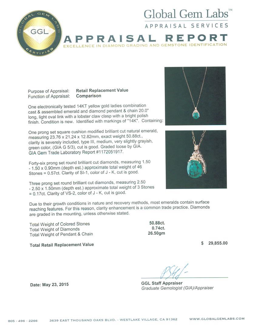 One electronically tested 14KT yellow gold ladies combination cast & assembled emerald and diamond pendant & chain 20.0" long, light oval link with a lobster claw clasp with a bright polish finish. Identified with markings of "14K". Condition is new. Containing: One prong set square cushion modified brilliant cut natural emerald, measuring 23.76 x 21.24 x 12.82mm, exact weight 50.88ct., clarity is severely included, type III, medium, very slightly grayish, green color, (GIA G 5/3), cut is good. Graded loose by GIA. GIA Gem Trade Laboratory Report #1172051917.Forty-Six prong set round brilliant cut diamonds, measuring 1.50 - 1.50 x 0.90mm (depth est.) approximate total weight of 46 Stones = 0.57ct. Clarity: SI-1. Color: J - K, Cut is Good. Three prong set round brilliant cut diamonds, measuring 2.50 - 2.50 x 1.50mm (depth est.) approximate total weight of 3 Stones = 0.17ct. Clarity: VS-2. Color: J - K, Cut is Good. Due to their growth conditions in nature and recovery methods, most emeralds contain surface reaching features. For this reason, clarity enhancement is a common trade practice. Diamonds are graded in the mounting, unless otherwise stated. Total Weight of Colored Stones 50.88ct. Total Weight of Diamonds 0.74ct. Total Weight of Pendant & Chain 26.50 grams. GGL Appraised at $29,855.00.