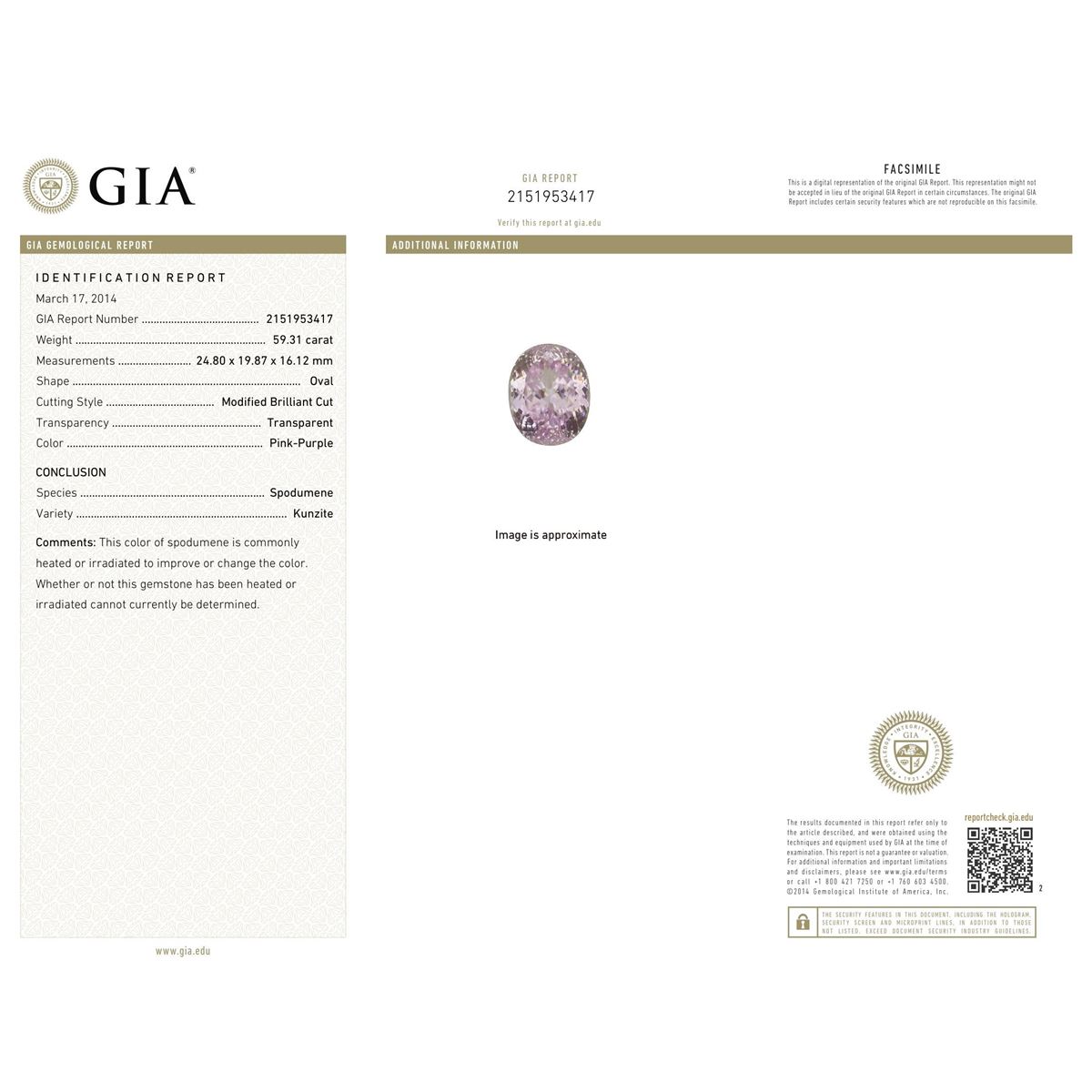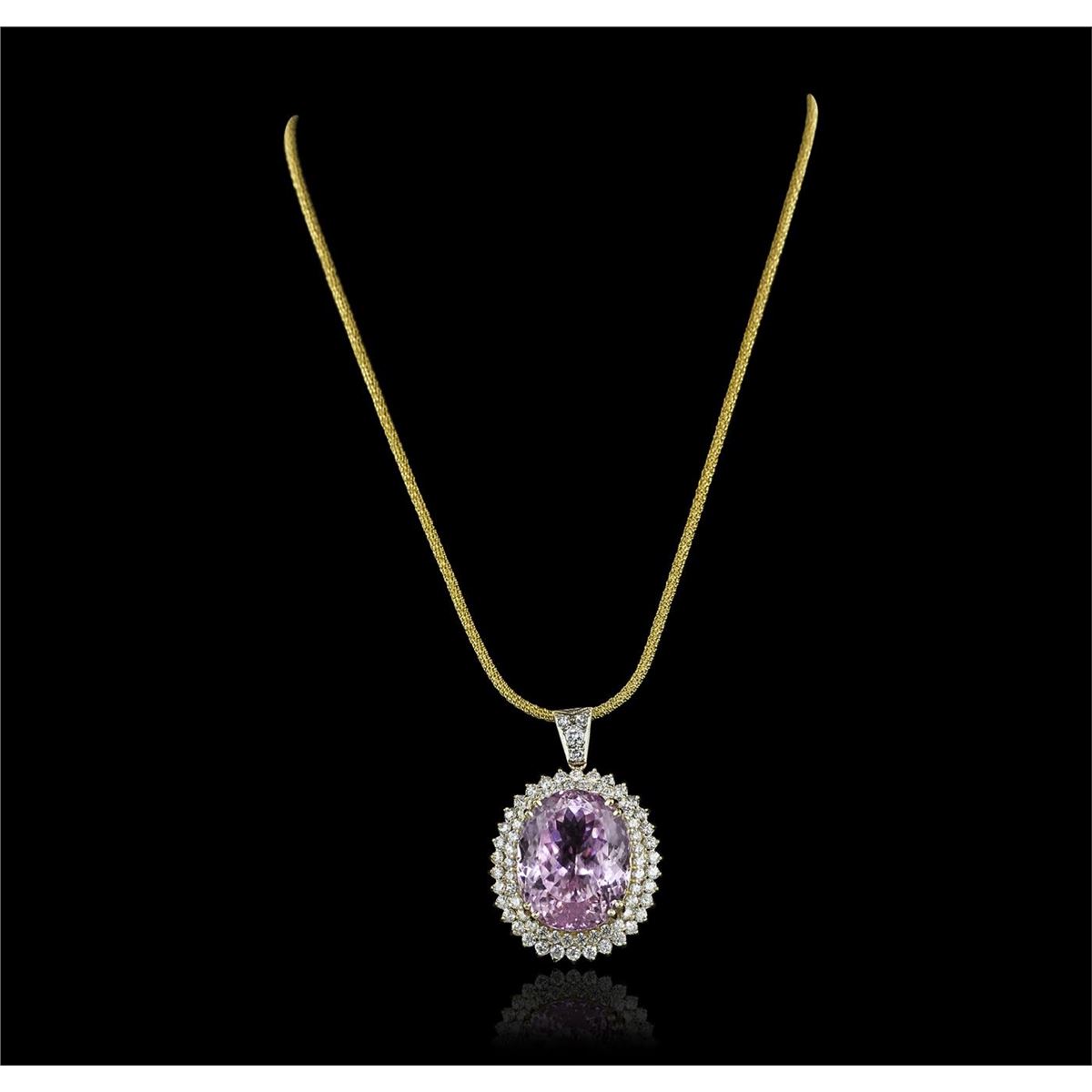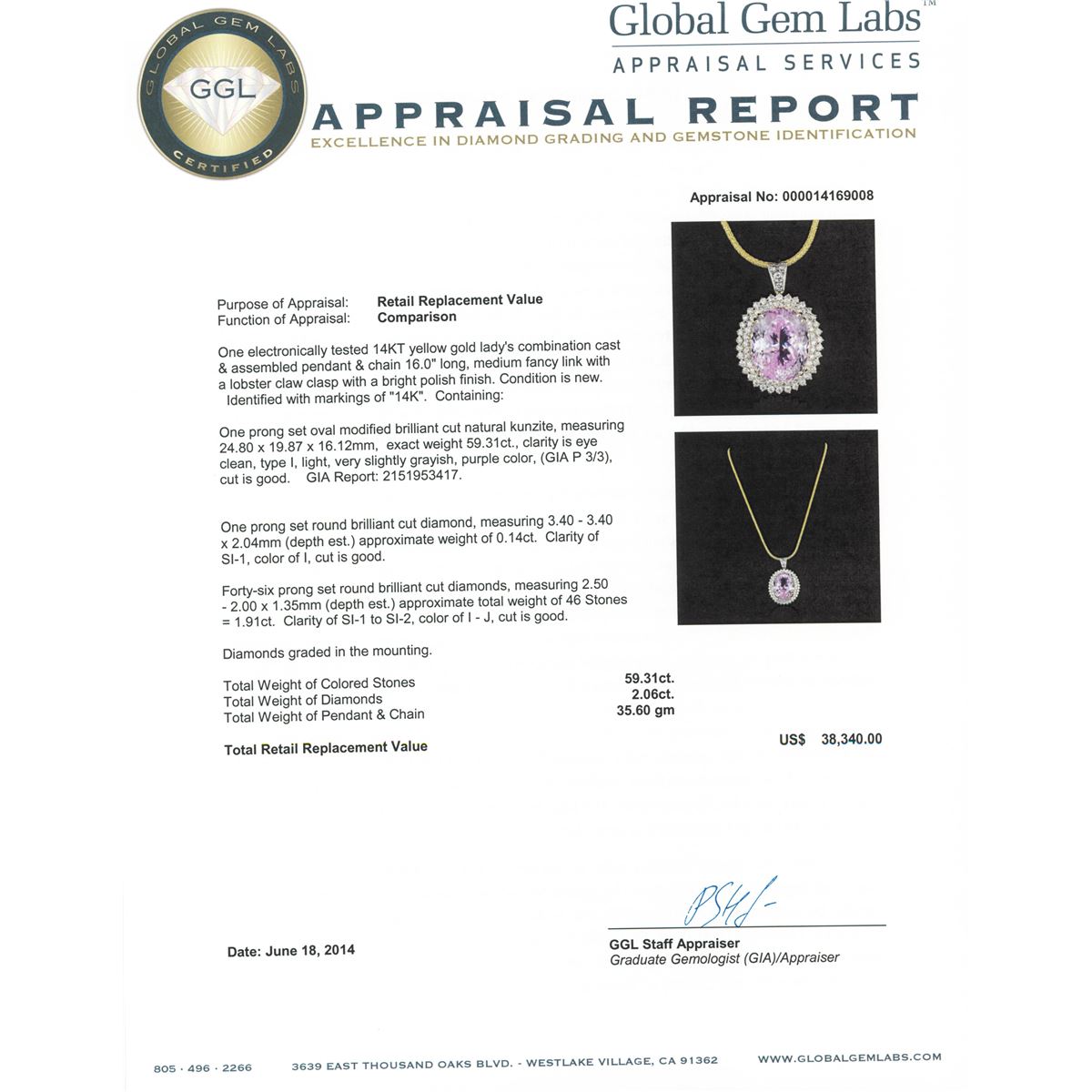 One electronically tested 14KT yellow gold Ladies combination cast & assembled pendant & chain 16.0" long, medium fancy link with a lobster claw clasp with a bright polish finish. Condition is new. Identified with markings of "14K". Containing: One prong set oval modified brilliant cut natural kunzite, measuring 24.80 x 19.87 x 16.12mm, exact weight 59.31ct., clarity is eye clean, type I, light, very slightly grayish, purple color, (GIA P 3/3), cut is good. GIA Report: 2151953417.One prong set round brilliant cut diamond, measuring 3.40 - 3.40 x 2.04mm (depth est.) approximate weight of 0.14ct. Clarity: SI-1. Color: I, Cut is Good. Forty-Six prong set round brilliant cut diamonds, measuring 2.50 - 2.00 x 1.35mm (depth est.) approximate. Total Weight of 46 Stones = 1.91ct. Clarity: SI-1 to SI-2. Color: I - J, Cut is Good. Diamonds graded in the mounting. Total Weight of Colored Stones 59.31ct. Total Weight of Diamonds 2.06ct. Total Weight of Pendant & Chain 35.60 grams. GGL Appraised at $38,340.00.
