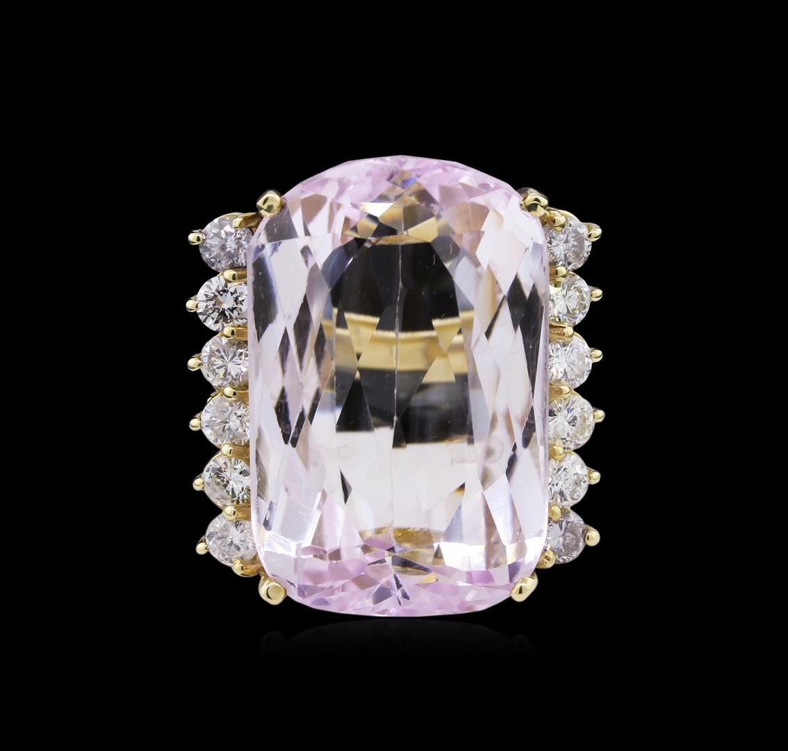 One electronically tested 14KT yellow gold ladies cast kunzite spodumene and diamond ring with a bright polish finish. Condition is new, good workmanship. The featured kunzite spodumene is framed by mirroring ribbons of diamonds, supported by split shoulders and completed by a two and one-half millimeter wide band. Identified with markings of "14K". Containing: One prong set rectangular cushion modified brilliant cut natural kunzite, measuring 28.03 x 18.20 x 13.44mm, 8%. bulge factor, exact weight 65.77ct., type I Clarity is eye clean, light, very slightly grayish, Pink-Purple color, (GIA PiP 3/3), cut is good. Transmitting light with no distortion, transparent. GIA Gemological Report attached. Graded loose prior to setting in the GIA Laboratory, Report #2151953638.Twelve prong set round brilliant cut diamonds, measuring 3.50 - 3.50 x 2.10mm (depth est.) approximate. Total Weight of 12 Stones = 1.98ct. Graded in the setting. Clarity: SI-2 to I-1. Color: G - I. Total Weight of Colored Stones 65.77ct. Total Weight of Diamonds 1.98ct. Total Weight of Ring 22.90gm. AIG Appraised at $27,435.00.