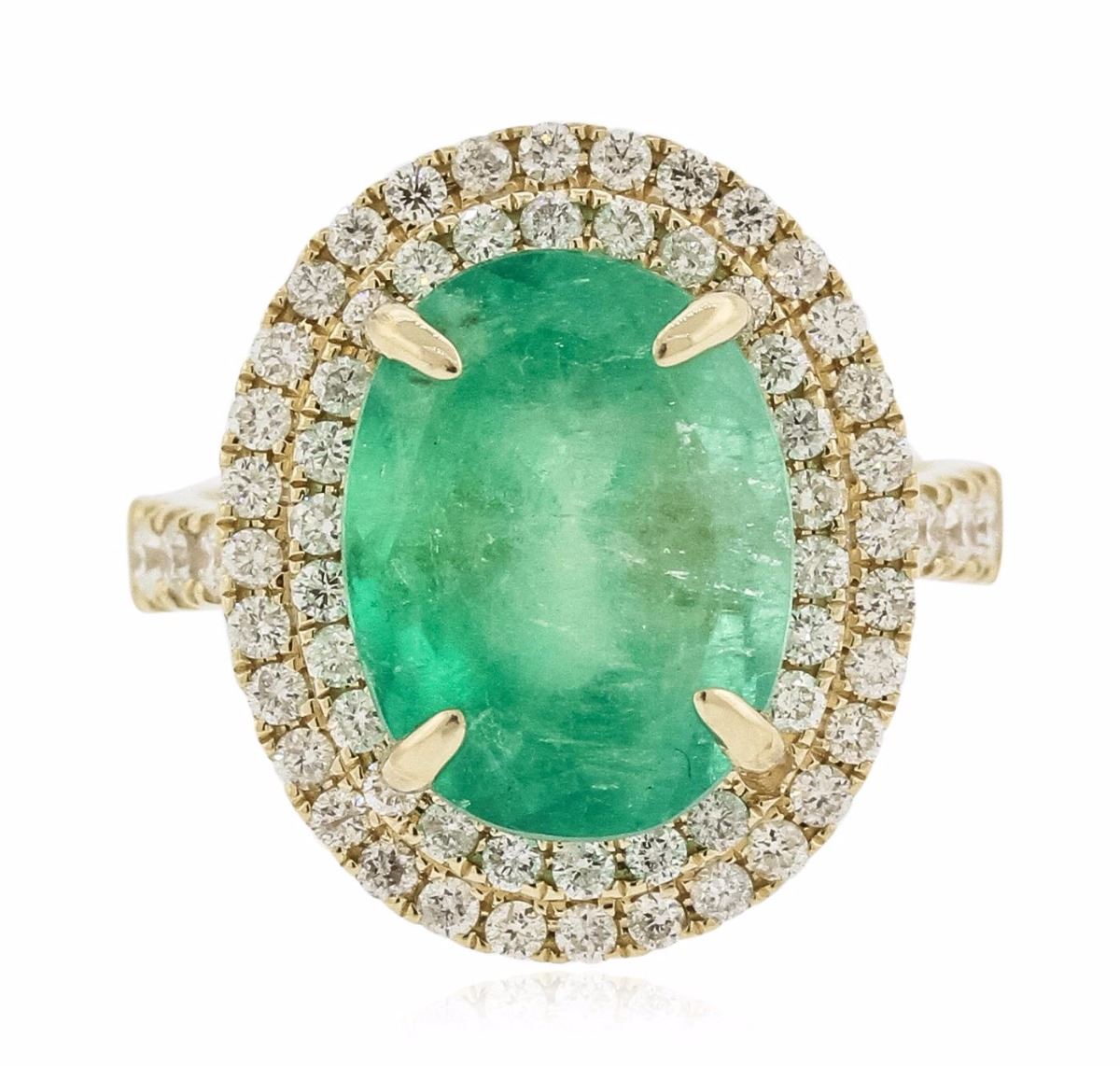 One electronically tested 14KT yellow gold ladies cast emerald & diamond ring with a bright finish. The featured emerald is set within a tiered diamond bezel, supported by diamond set shoulders, completed by a three millimeter wide band. Identified with markings of 14K. Condition is new, good workmanship. Containing: One prong set oval mixed cut natural emerald, measuring 13.85 x 10.53 x 9.05mm, exact weight 7.45ct., clarity is heavily included, type III, medium, very slightly grayish, very strongly bluish green color, (GIA vstbG 5/3), cut is good. Transmitting light somewhat diffusely, translucent. Naturally occurring internal & external characteristics are present. Indications of clarity enhancement. Graded loose prior to setting in the GIA Laboratory, Report # 2161542638. Graded in the setting. Sixty-Four prong set round brilliant cut diamonds, measuring 2.00 - 1.50 x 1.05mm (depth est.) approximate total weight of 64 Stones = 0.92ct. Graded in the setting. Clarity: I-1 to I-2. Color: G - I. Total Weight of Colored Stones 7.45ct. Total Weight of Diamonds 0.92ct. Total Weight of Ring 7.92 grams. AIG Appraised at $14,300.00.