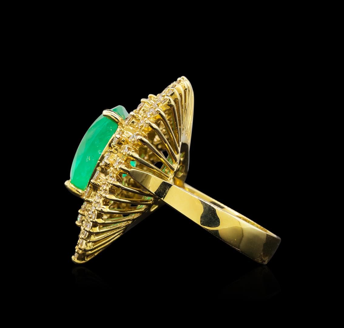 One electronically tested 14KT yellow gold ladies cast emerald and diamond ring with a bright polish finish. Identified with markings of "K14". Condition is new. Containing: One prong set pear modified brilliant cut natural emerald, measuring 13.30 x 13.92 x 7.69mm, exact weight 7.47ct., clarity is heavily included, type III, medium light, very slightly grayish, very slightly bluish green color, (GIA vslbG 4/3) Graded loose prior to setting by GIA Gemological Laboratory. GIA report: 2175049264.One Hundred Twenty-Six prong set round brilliant cut diamonds, measuring 1.90 - 1.20 x 0.93mm (depth est.) approximate total weight of 126 Stones = 1.52ct. Clarity: SI-1. Color: I - J, Cut is Good. Colored gemstones are presumed to have been subjected to commonly used enhancement processes. All diamonds and colored gemstones are graded in the mounting, unless otherwise stated. Total Weight of Colored Stones 7.47ct. Total Weight of Diamonds 1.52ct. Total Weight of Ring 12.30 grams. GGL Appraised at $13,130.00.