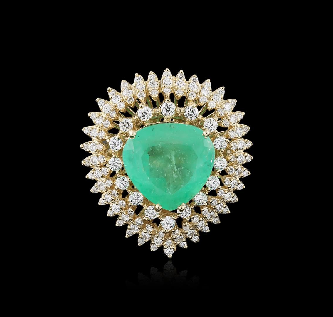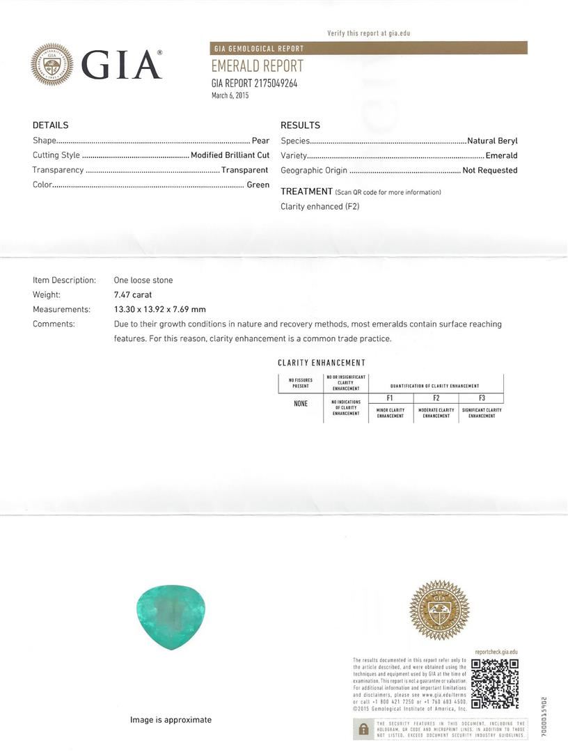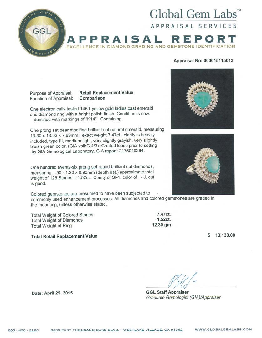 One electronically tested 14KT yellow gold ladies cast emerald and diamond ring with a bright polish finish. Identified with markings of "K14". Condition is new. Containing: One prong set pear modified brilliant cut natural emerald, measuring 13.30 x 13.92 x 7.69mm, exact weight 7.47ct., clarity is heavily included, type III, medium light, very slightly grayish, very slightly bluish green color, (GIA vslbG 4/3) Graded loose prior to setting by GIA Gemological Laboratory. GIA report: 2175049264.One Hundred Twenty-Six prong set round brilliant cut diamonds, measuring 1.90 - 1.20 x 0.93mm (depth est.) approximate total weight of 126 Stones = 1.52ct. Clarity: SI-1. Color: I - J, Cut is Good. Colored gemstones are presumed to have been subjected to commonly used enhancement processes. All diamonds and colored gemstones are graded in the mounting, unless otherwise stated. Total Weight of Colored Stones 7.47ct. Total Weight of Diamonds 1.52ct. Total Weight of Ring 12.30 grams. GGL Appraised at $13,130.00.
