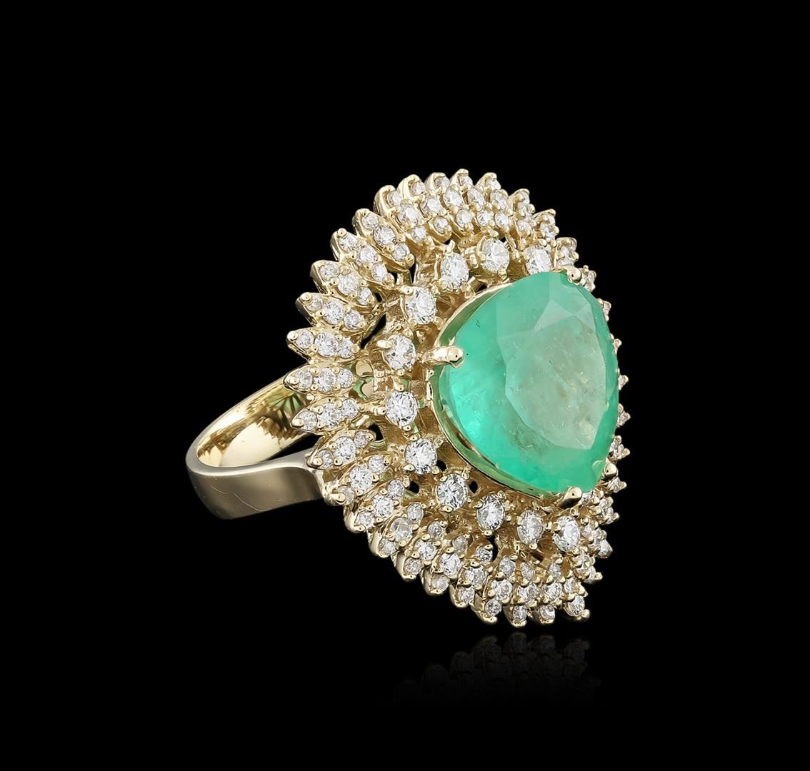 One electronically tested 14KT yellow gold ladies cast emerald and diamond ring with a bright polish finish. Identified with markings of "K14". Condition is new. Containing: One prong set pear modified brilliant cut natural emerald, measuring 13.30 x 13.92 x 7.69mm, exact weight 7.47ct., clarity is heavily included, type III, medium light, very slightly grayish, very slightly bluish green color, (GIA vslbG 4/3) Graded loose prior to setting by GIA Gemological Laboratory. GIA report: 2175049264.One Hundred Twenty-Six prong set round brilliant cut diamonds, measuring 1.90 - 1.20 x 0.93mm (depth est.) approximate total weight of 126 Stones = 1.52ct. Clarity: SI-1. Color: I - J, Cut is Good. Colored gemstones are presumed to have been subjected to commonly used enhancement processes. All diamonds and colored gemstones are graded in the mounting, unless otherwise stated. Total Weight of Colored Stones 7.47ct. Total Weight of Diamonds 1.52ct. Total Weight of Ring 12.30 grams. GGL Appraised at $13,130.00.