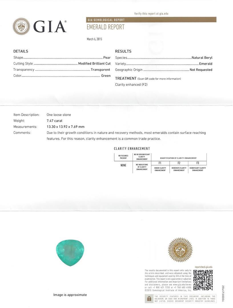 One electronically tested 14KT yellow gold ladies cast emerald and diamond ring with a bright polish finish. Identified with markings of "K14". Condition is new. Containing: One prong set pear modified brilliant cut natural emerald, measuring 13.30 x 13.92 x 7.69mm, exact weight 7.47ct., clarity is heavily included, type III, medium light, very slightly grayish, very slightly bluish green color, (GIA vslbG 4/3) Graded loose prior to setting by GIA Gemological Laboratory. GIA report: 2175049264.One Hundred Twenty-Six prong set round brilliant cut diamonds, measuring 1.90 - 1.20 x 0.93mm (depth est.) approximate total weight of 126 Stones = 1.52ct. Clarity: SI-1. Color: I - J, Cut is Good. Colored gemstones are presumed to have been subjected to commonly used enhancement processes. All diamonds and colored gemstones are graded in the mounting, unless otherwise stated. Total Weight of Colored Stones 7.47ct. Total Weight of Diamonds 1.52ct. Total Weight of Ring 12.30 grams. GGL Appraised at $13,130.00.