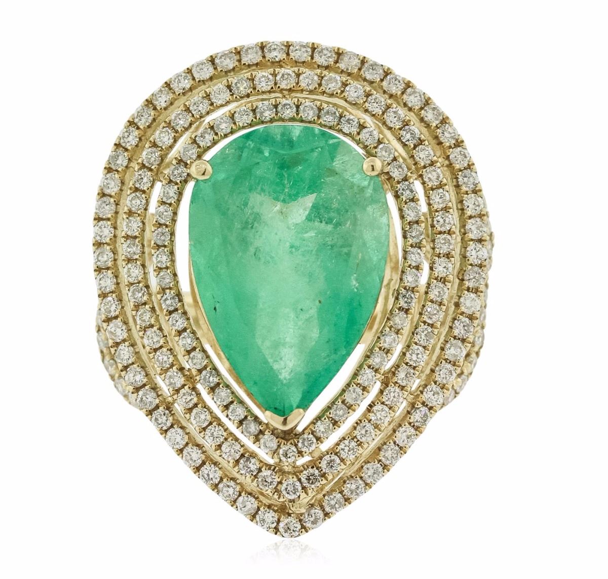 One electronically tested 14KT yellow gold ladies cast emerald & diamond ring with a bright finish. The featured emerald is set within tiered diamond bezels, supported by diamond set shoulders and an elaborate under gallery, completed by a three millimeter wide band. Identified with markings of 14K. Condition is new, good workmanship. Containing: One prong set pear mixed cut natural emerald, measuring 17.15 x 11.49 x 8.05mm, exact weight 7.70ct., clarity is moderately included, medium, very slightly grayish, very slightly greenish blue color, (GIA vslgB 5/3), cut is good. Transmitting light somewhat diffusely, transparent to translucent. Naturally occurring internal & external characteristics are present. Indications of clarity enhancement. Graded loose prior to setting in the GIA Laboratory, Report # 2161542597. The GIA Report is attached. Two Hundred Eight prong set round brilliant cut diamonds, measuring 1.40 - 1.00 x 0.72mm (depth est.) approximate total weight of 208 Stones = 1.20ct. Graded in the setting. Clarity: SI-1 to I-1. Color: G - H. Total Weight of Colored Stones 7.70ct. Total Weight of Diamonds 1.20ct. Total Weight of Ring 9.35 grams. AIG Appraised at $25,990.00.