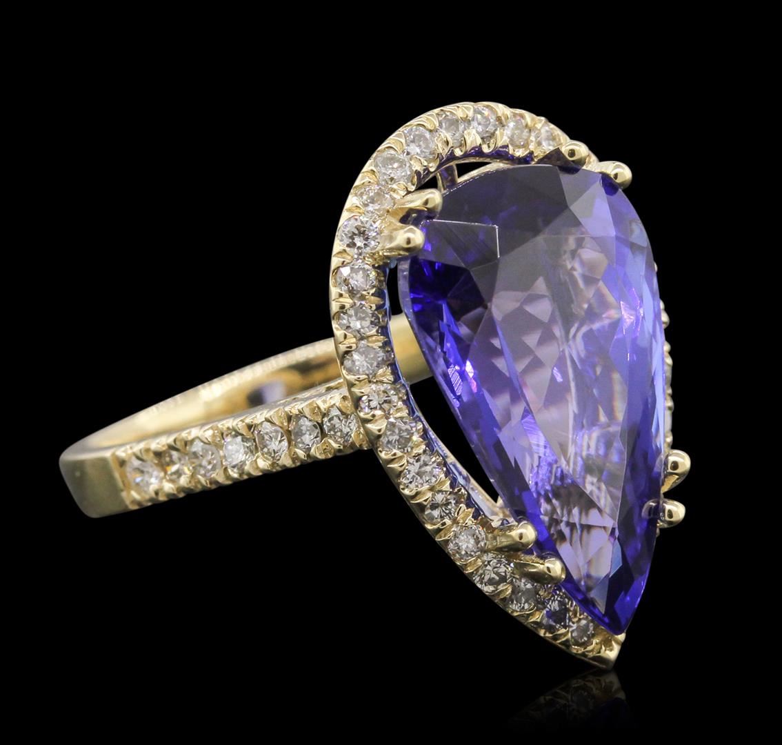 One electronically tested 14KT yellow gold ladies cast tanzanite and diamond ring with a bright polish finish. Condition is new, good workmanship. The featured tanzanite is set within a diamond bezel , supported by diamond set shoulders and completed by a two and one-half millimeter wide band. Identified with markings of "K14". Containing: One prong set pear modified brilliant cut natural tanzanite, measuring 17.36 x 10.66 x 7.76mm, exact weight 8.69ct., clarity is eye clean, type I, cut is good. Clarity is eye clean, medium dark, very slightly grayish, Violet-Blue color, (GIA VB 6/3), cut is good. Transmitting light with no distortion, transparent. GIA Gemological Report attached. Graded loose prior to setting in the GIA Laboratory, Report # 2151735554.Tanzanite is a very rare gemstone that is only found in the country of Tanzania. Originally discovered in 1967. Tiffany & Company, named the stone Tanzanite. It is found in the Usumburu Mountains that border the Umba Valley of northern Tanzania. Tanzanite occurs in gray, brown, violet, blue, reddish-purple, & green. The gem is interesting because of its exceptional pleochroism. Rotated in different directions a tanzanite will exhibit multiple changes of color. Tanzanite has a low tolerance to ultrasonic cleaning, and should not be cleaned using this method. Forty-Seven prong set round brilliant cut diamonds, measuring 1.60 - 1.40 x 0.90mm (depth est.) approximate. Total Weight of 47 Stones = 0.67ct. Graded in the setting. Clarity: SI-2 to I-2. Color: I - K. Total Weight of Colored Stones 8.69ct. Total Weight of Diamonds 0.67ct. Total Weight of Ring 6.20 grams. AIG Appraised at $26,380.00.