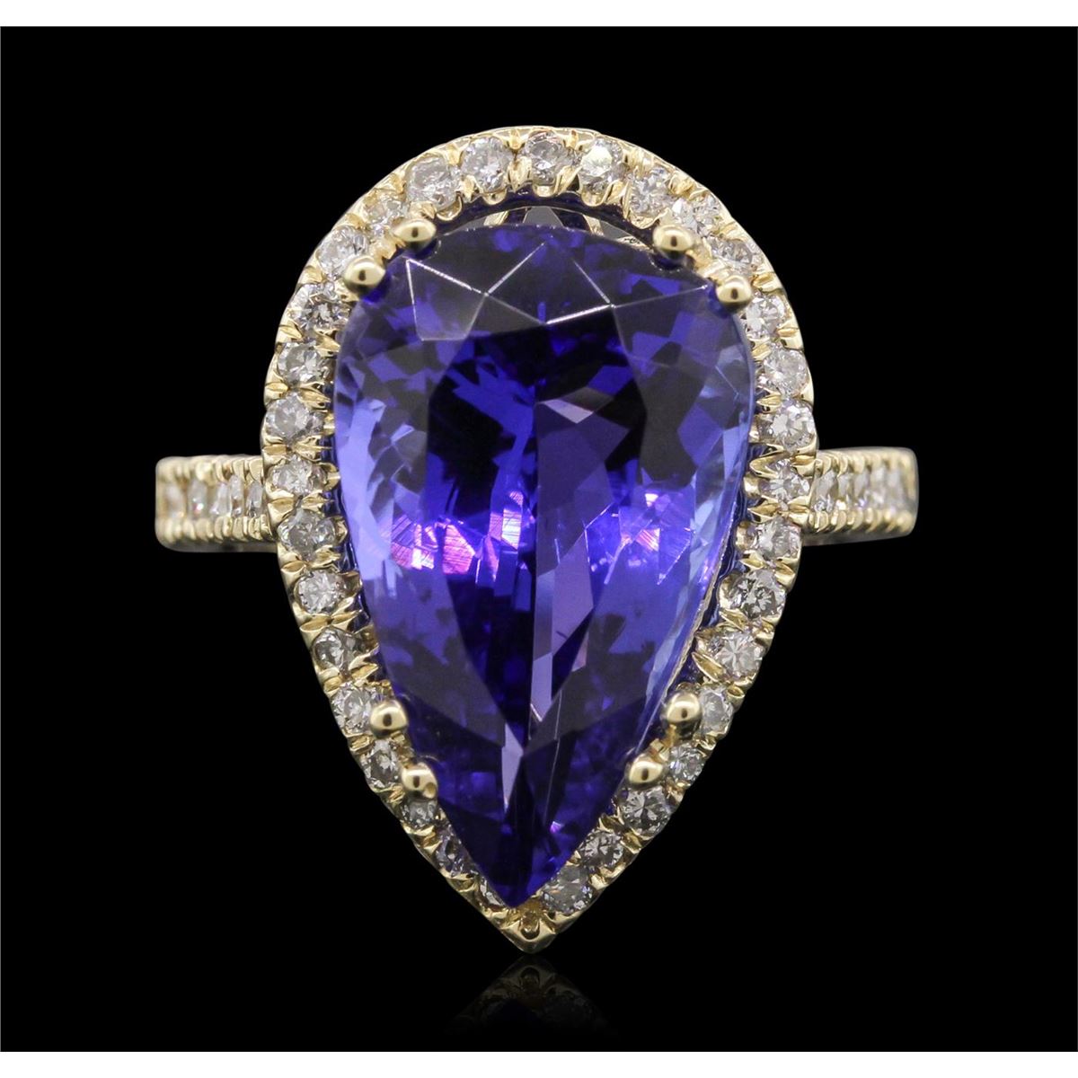 One electronically tested 14KT yellow gold ladies cast tanzanite and diamond ring with a bright polish finish. Condition is new, good workmanship. The featured tanzanite is set within a diamond bezel , supported by diamond set shoulders and completed by a two and one-half millimeter wide band. Identified with markings of "K14". Containing: One prong set pear modified brilliant cut natural tanzanite, measuring 17.36 x 10.66 x 7.76mm, exact weight 8.69ct., clarity is eye clean, type I, cut is good. Clarity is eye clean, medium dark, very slightly grayish, Violet-Blue color, (GIA VB 6/3), cut is good. Transmitting light with no distortion, transparent. GIA Gemological Report attached. Graded loose prior to setting in the GIA Laboratory, Report # 2151735554.Tanzanite is a very rare gemstone that is only found in the country of Tanzania. Originally discovered in 1967. Tiffany & Company, named the stone Tanzanite. It is found in the Usumburu Mountains that border the Umba Valley of northern Tanzania. Tanzanite occurs in gray, brown, violet, blue, reddish-purple, & green. The gem is interesting because of its exceptional pleochroism. Rotated in different directions a tanzanite will exhibit multiple changes of color. Tanzanite has a low tolerance to ultrasonic cleaning, and should not be cleaned using this method. Forty-Seven prong set round brilliant cut diamonds, measuring 1.60 - 1.40 x 0.90mm (depth est.) approximate. Total Weight of 47 Stones = 0.67ct. Graded in the setting. Clarity: SI-2 to I-2. Color: I - K. Total Weight of Colored Stones 8.69ct. Total Weight of Diamonds 0.67ct. Total Weight of Ring 6.20 grams. AIG Appraised at $26,380.00.